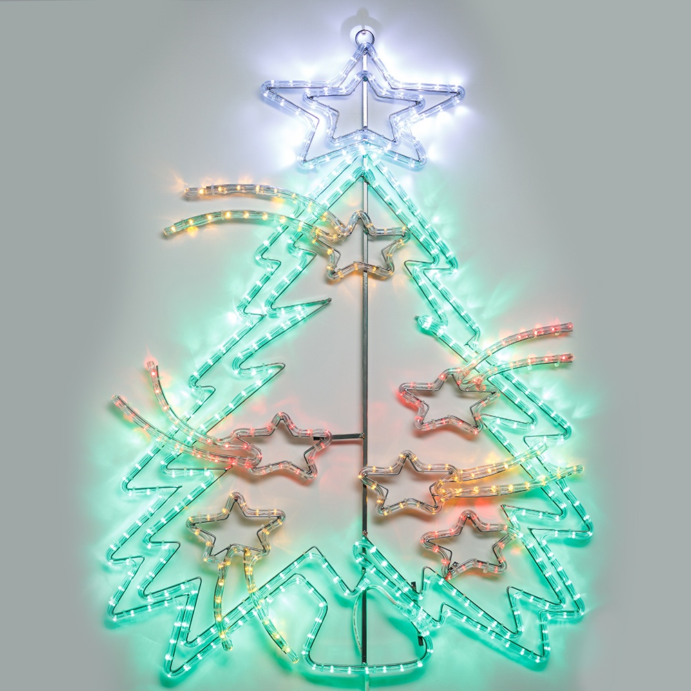 Светодиодная фигура НОВОГОДНЯЯ ЕЛЬ. Размер 1000x770 мм. Цвет светодиодов ЗЕЛЕНЫЙ / ЖЕЛТЫЙ / КРАСНЫЙ / ТЕПЛЫЙ БЕЛЫЙ (3000 К), постоянное свечение. 648 светодиодов. Напряжение питания 230 В, потребляемая мощность 361 Вт, степень пылевлагозащиты IP65. Фигура укомплектована проводом питания для подключения к сети 230 В (без вилки питания).
