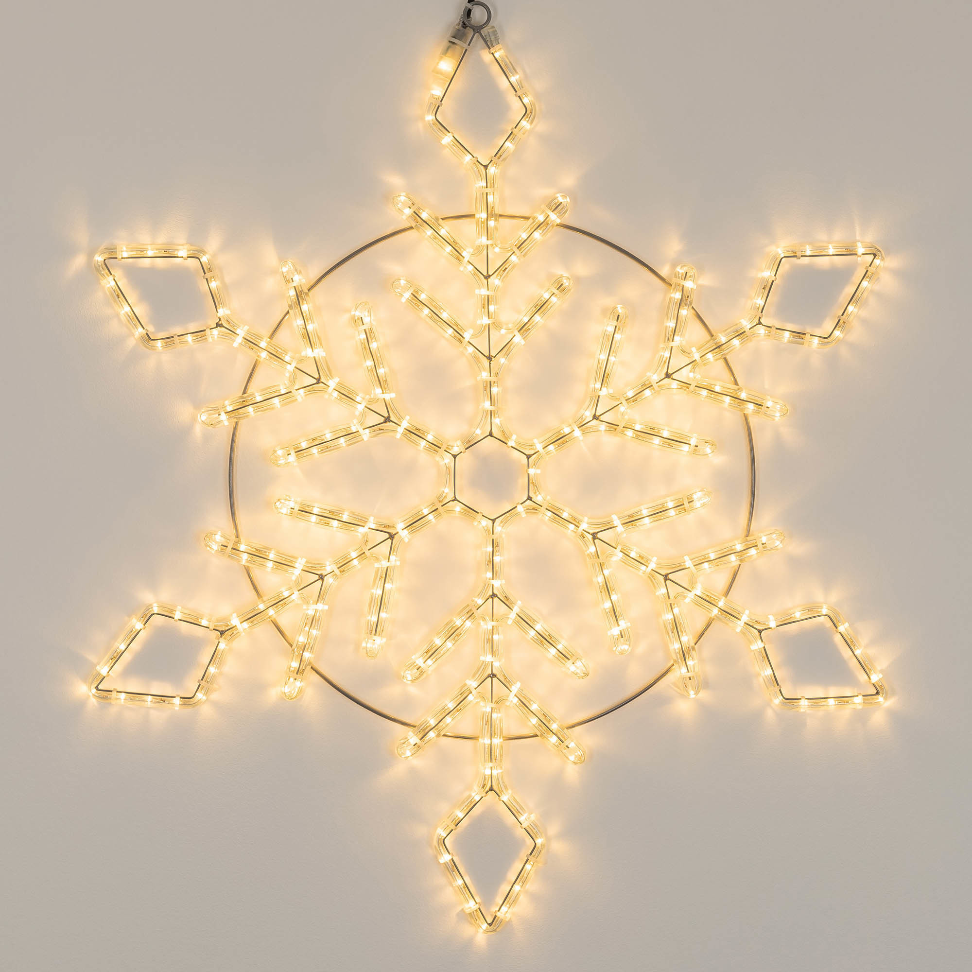 Светодиодная фигура СНЕЖИНКА отлично подходит для украшения и создания праздничной атмосферы как внутри помещений, так и снаружи (степень пылевлагозащиты IP65 позволяет размещать гирлянду на улице под навесом). Размер фигуры 900x900 мм. Тёплый белый свет и постоянное свечение помогают создать сказочную атмосферу в выбранной локации. Фигура укомплектована проводом питания для подключения к сети 230 В (без вилки питания).