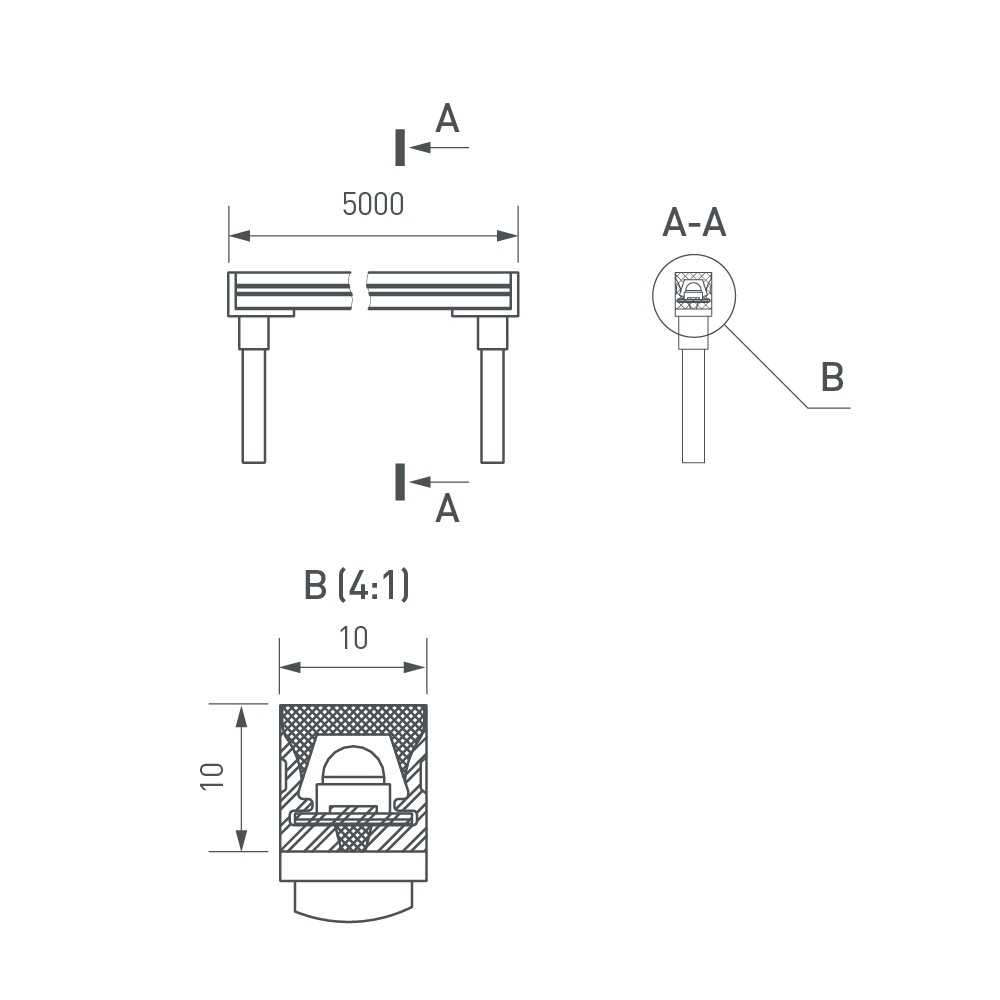 Характеристики - Грейзер THOR-TOP-B70-10x10mm 24V Day4000 (15 W/m, IP67, 5m, wire x2) (Arlight, Вывод вниз, 3 года)