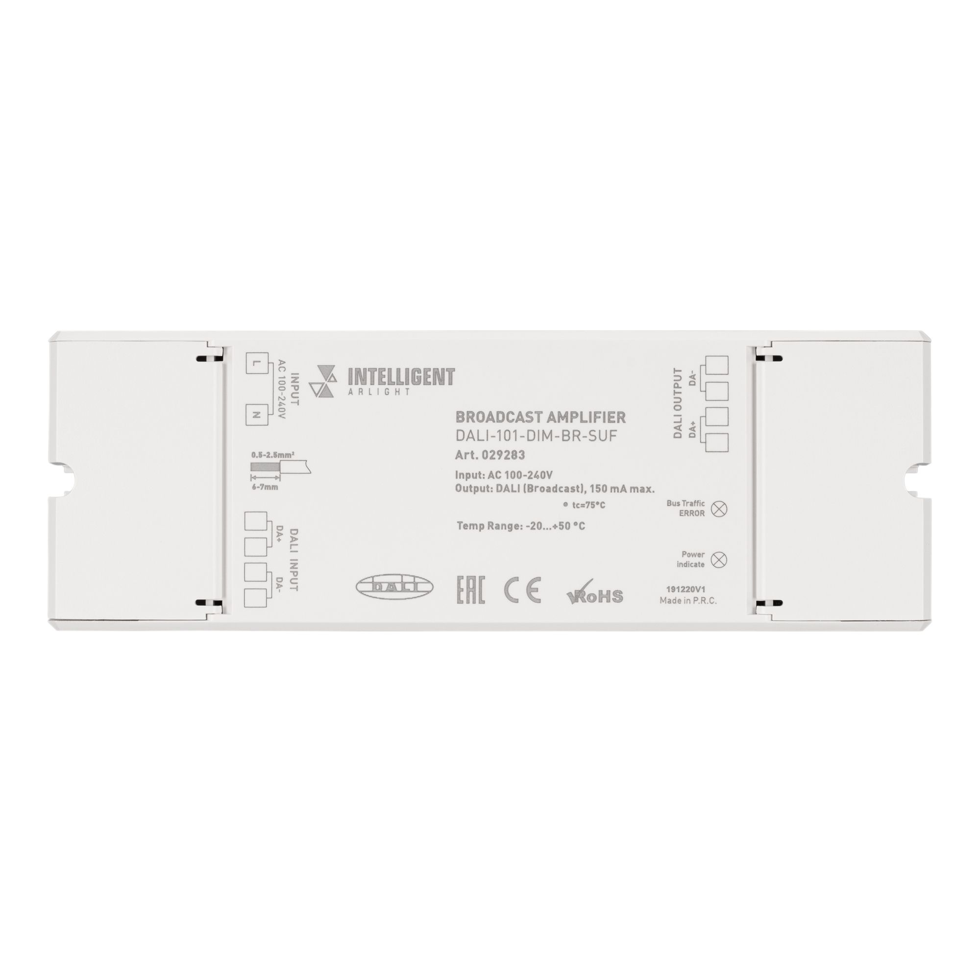 Усилитель (ретранслятор) сигнала DALI служит для трансляции команд с основной шины DALI на дополнительную в виде широковещательных команд (Broadcast), тем самым, увеличивая количество подключаемых устройств к шине DALI. Содержит встроенный источник питания, дополнительное питания после усилителя не требуется. На основной шине DALI занимает 1 адрес, адресация устройств на дополнительной линии DALI не требуется, т.к. все они управляются по адресу усилителя. Тип устройства DALI DT6. Питание устройства от 230В. Габариты усилителя составляют 170x59x29мм, корпус белого цвета.