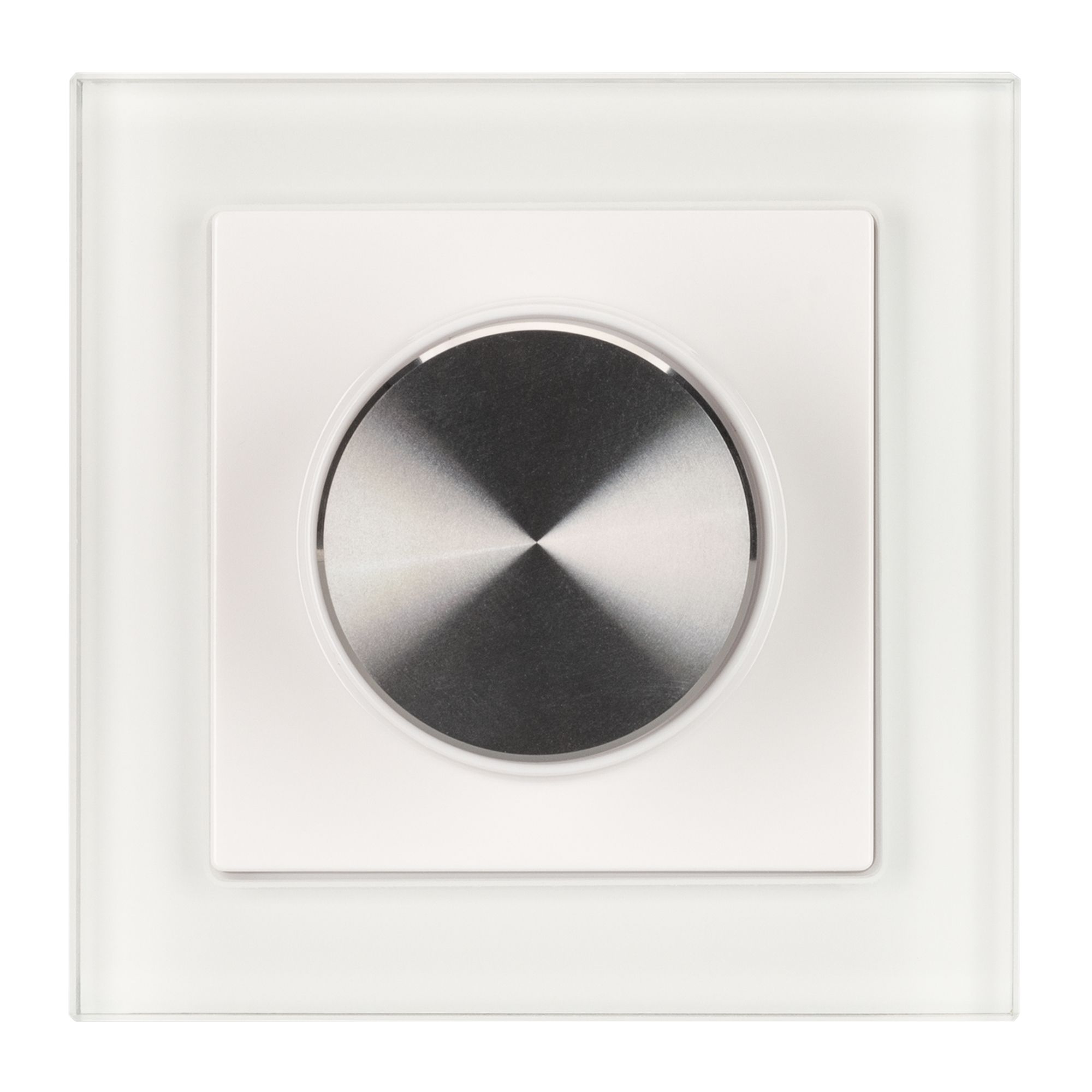 Встраиваемая стеклянная панель белого цвета с роторным вращателем (потенциометром), предназначенная для управления светодиодным или любым другим осветительным оборудованием, работающим в протоколе DALI. С помощью панели осуществляется регулировка яркости, включение/выключение света и управление цветом свечения. Панель совместима с любыми двухканальными (MIX) исполнительными устройствами стандарта DALI DT8. Установка номера группы или режима Broadcast выполняется переключателем на задней стороне панели. Питание устройства осуществляется от шины DALI, тип устройства DALI DT6. Установка адреса управления выполняется переключателями на корпусе. Габариты устройства составляют 80х80х40 мм, подсветка регулятора во включенном состоянии, установка в стандартный подрозетник. Панель совместима с декоративными рамками ведущих мировых производителей (GIRA, JUNG, BERKER, MERTEN). Стандартная рамка входит в комплект поставки.