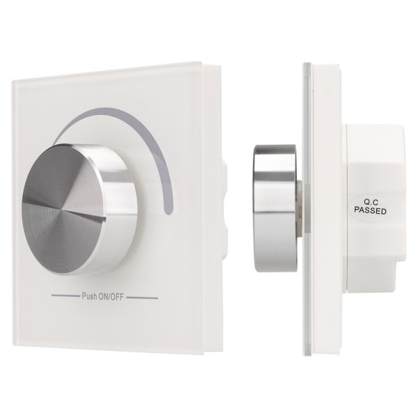 Встраиваемая стеклянная панель белого цвета с роторным вращателем (потенциометром), предназначенная для управления светодиодным или любым другим осветительным оборудованием, работающим в протоколе DALI. С помощью панели осуществляется регулировка яркости и включение/выключение света. Панель совместима с любыми исполнительными устройствами стандарта DALI. Питание устройства осуществляется от шины DALI, управление 1 адресом DALI или всей шиной (Broadcast). Установка адреса управления выполняется переключателями на корпусе. Габариты устройства составляют 86х86х45 мм, установка в стандартный подрозетник.