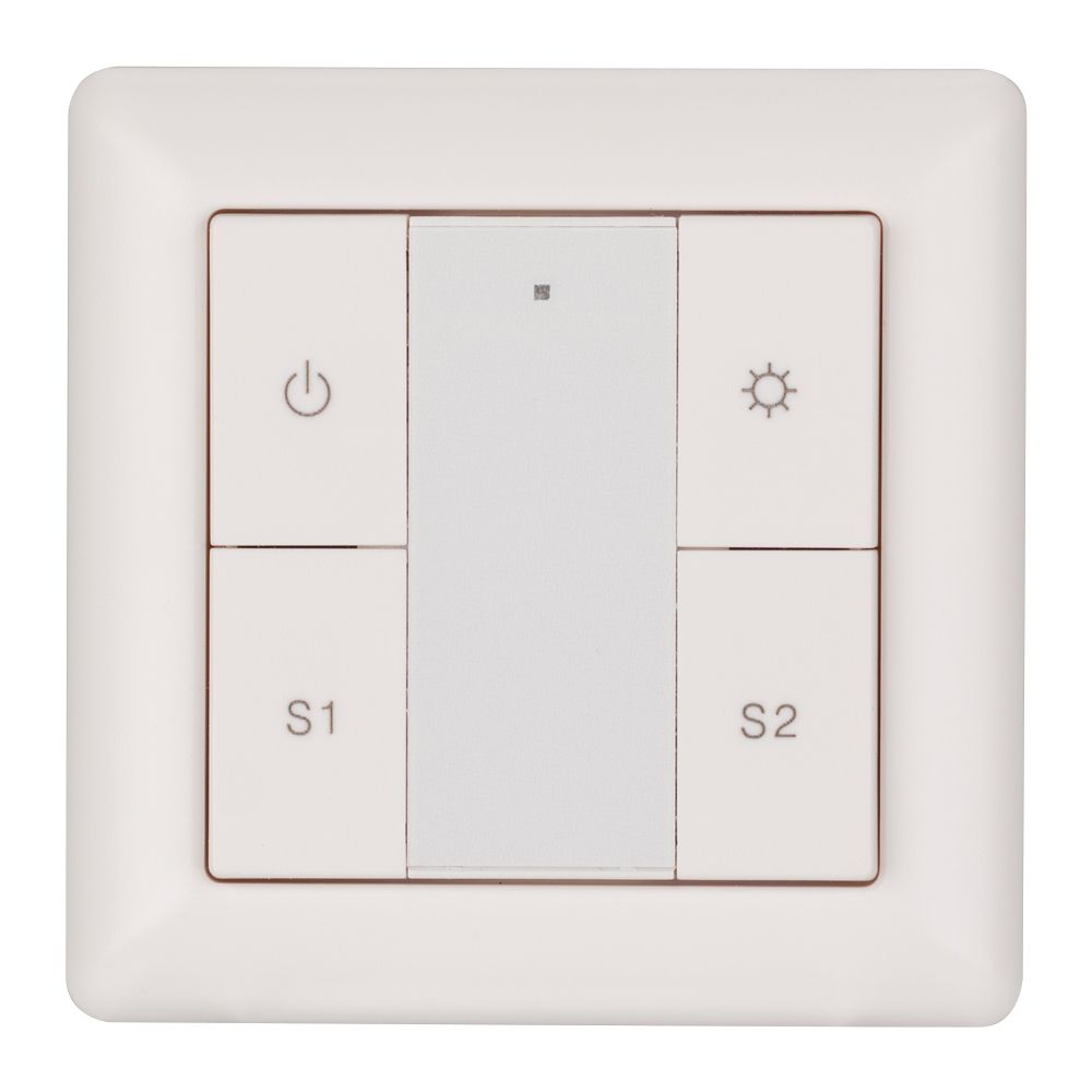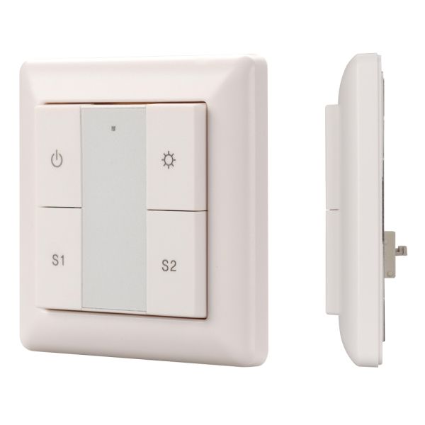 Встраиваемая пластиковая панель белого цвета с кнопочным управлением, предназначенная для управления одноцветными светодиодными лентами, светильниками и другими источниками света в системах управления светом DALI. Позволяет включать/выключать свет в одной группе, менять его яркость, сохранять и вызывать до 2 световых сцен. Установка номера группы и сцен выполняется переключателями на задней стороне панели. Устройство совместимо с диммерами стандарта DALI. Передача команд от панели к диммерам выполняется по общей двухпроводной шине DALI. Удобное и точное управление при помощи отдельных механических кнопок для каждой функции. Питание от шины DALI. Габариты устройства составляют 81х81х22.5 мм. Панель совместима с декоративными рамками ведущих мировых производителей (GIRA, JUNG, BERKER, MERTEN). Стандартная рамка входит в комплект поставки.