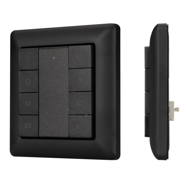 Встраиваемая пластиковая панель чёрного цвета с кнопочным управлением, предназначенная для управления одноцветными светодиодными лентами, светильниками и другими источниками света в системах управления светом DALI. Позволяет включать/выключать свет в одной группе, менять его яркость, сохранять и вызывать до 4 световых сцен. Установка номера группы и сцен выполняется переключателями на задней стороне панели. Устройство совместимо с диммерами стандарта DALI. Передача команд от панели к диммерам выполняется по общей двухпроводной шине DALI. Удобное и точное управление при помощи отдельных механических кнопок для каждой функции. Питание от шины DALI. Габариты устройства составляют 81х81х22.5 мм. Панель совместима с декоративными рамками ведущих мировых производителей (GIRA, JUNG, BERKER, MERTEN). Стандартная рамка входит в комплект поставки.