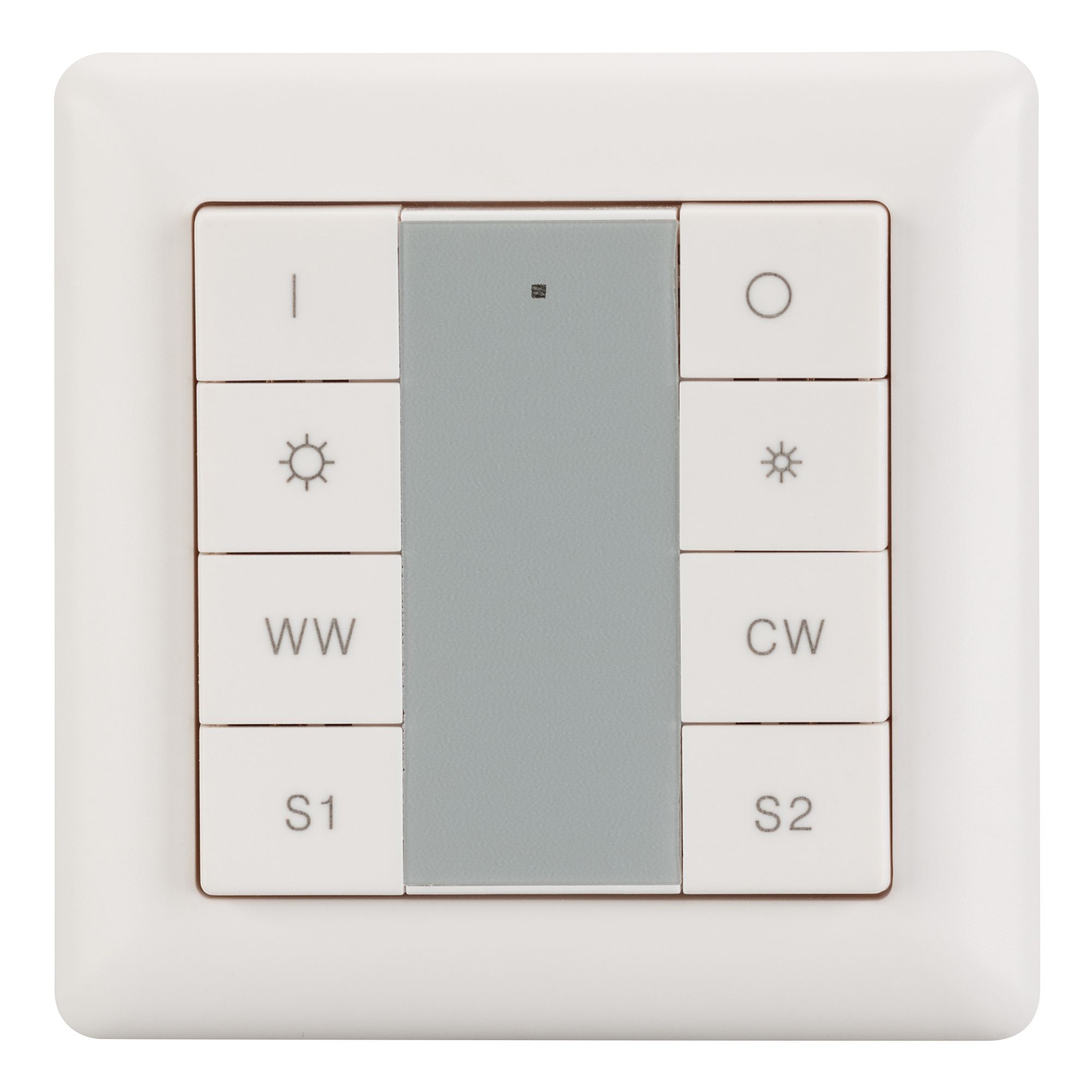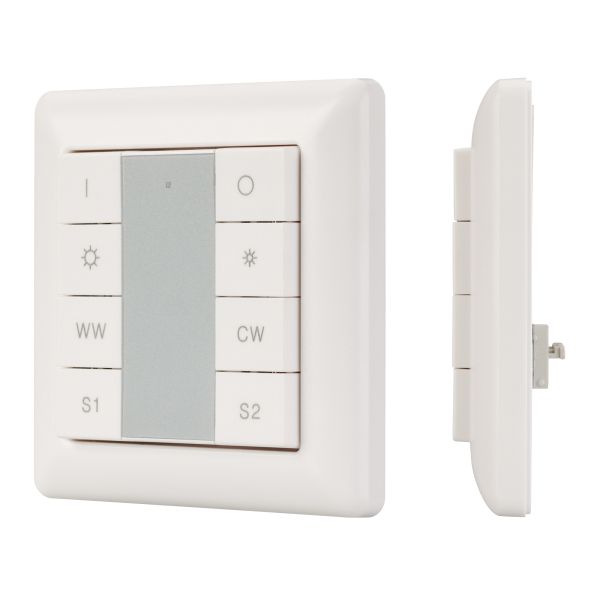 Встраиваемая пластиковая панель белого цвета с кнопочным управлением, предназначенная для управления мультибелымии MIX светодиодными лентами, светильниками и другими источниками света в системах управления светом DALI DT8. Позволяет включать/выключать свет, менять его яркость и управлять оттенком свечения белого цвета в 1 группе либо в режиме широковещателя (Broadcast). Сохранение и вызов 2 сцен. Установка номера группы и сцен выполняется переключателями на задней стороне панели. Устройство совместимо с диммерами стандарта DALI. Передача команд от панели к диммерам выполняется по общей двухпроводной шине DALI. Удобное и точное управление при помощи отдельных механических кнопок для каждой функции. Питание от шины DALI. Габариты устройства составляют 81х81х22.5 мм. Панель совместима с декоративными рамками ведущих мировых производителей (GIRA, JUNG, BERKER, MERTEN). Стандартная рамка входит в комплект поставки.