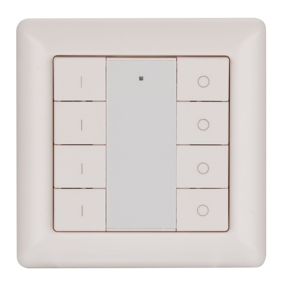 Встраиваемая пластиковая панель белого цвета с кнопочным управлением, предназначенная для управления одноцветными светодиодными лентами, светильниками и другими источниками света в системах управления светом DALI. Позволяет включать/выключать свет и менять его яркость в 4 группах либо в режиме широковещателя (Broadcast). Установка номера группы и сцен выполняется переключателями на задней стороне панели. Устройство совместимо с диммерами стандарта DALI. Передача команд от панели к диммерам выполняется по общей двухпроводной шине DALI. Удобное и точное управление при помощи отдельных механических кнопок для каждой функции. Питание от шины DALI. Габариты устройства составляют 81х81х22.5 мм. Панель совместима с декоративными рамками ведущих мировых производителей (GIRA, JUNG, BERKER, MERTEN). Стандартная рамка входит в комплект поставки.