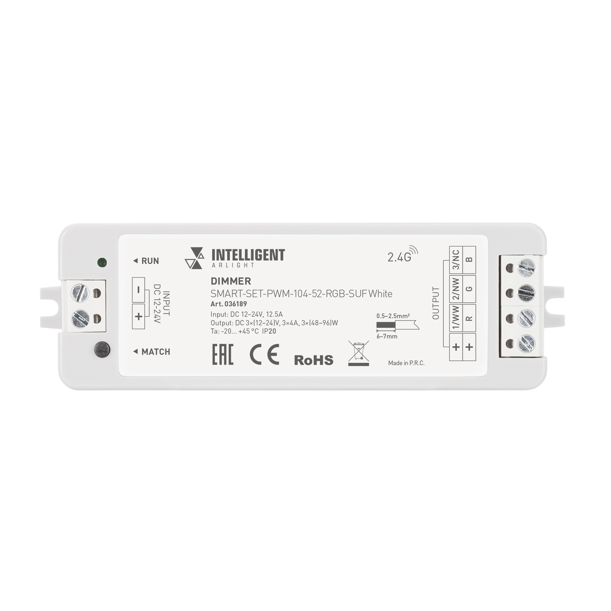 Характеристики - INTELLIGENT ARLIGHT Диммер SMART-SET-PWM-104-52-RGB-SUF White (12-24V, 3x4A, ПДУ LINE, 2.4G) (IARL, IP20 Пластик, 5 лет)