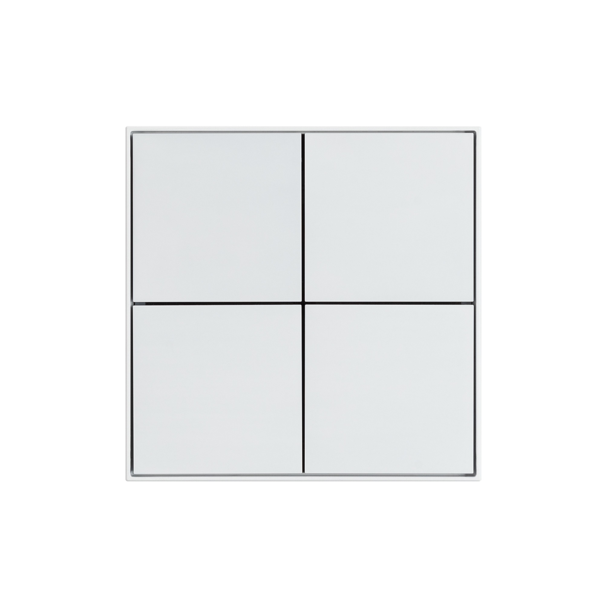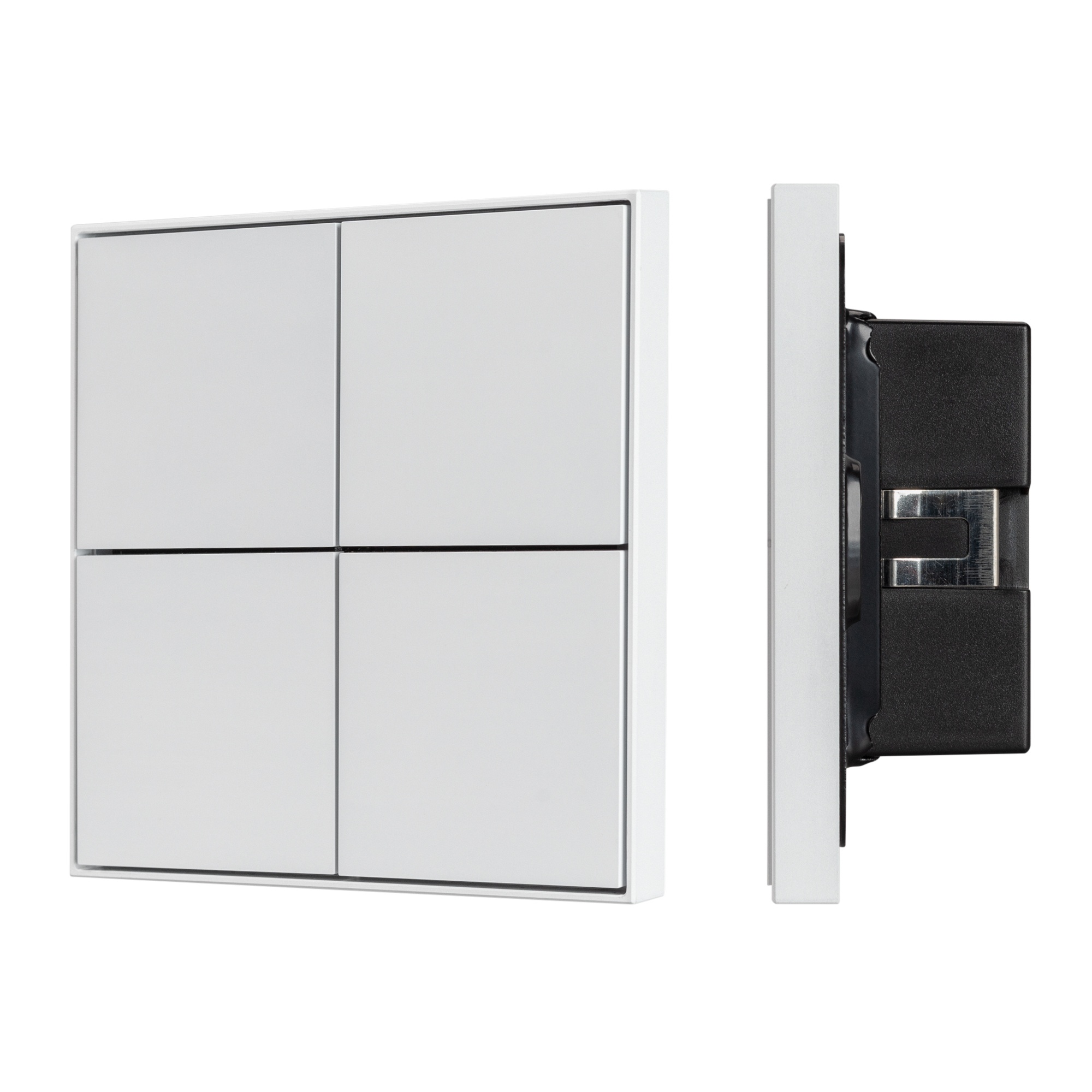 Встраиваемая металлическая панель белого цвета с кнопочным управлением, предназначенная для включения и выключения световых сцен в системах управления светом KNX. Позволяет осуществлять включение/выключение, диммирование, управление шторами и жалюзи, управлять сценами. Поддерживает управление с помощью 4 настраиваемых рокерных клавиш. Каждая клавиша может выполнять функции 2-х клавиш. Устройство совместимо с исполнительными устройствами стандарта KNX, в том числе, мировых производителей ABB, SCHNEIDER ELECTRIC, SIEMENS, ZENNIO и другими. Удобное и точное управление при помощи отдельных механических кнопок для каждой функции. Питание от шины KNX. Габариты устройства составляют 86x86x33 мм. Пластиковый корпус, цвет белый, тонкая рамка, материал - алюминий, отклик вибрацией, светодиодная индикация.