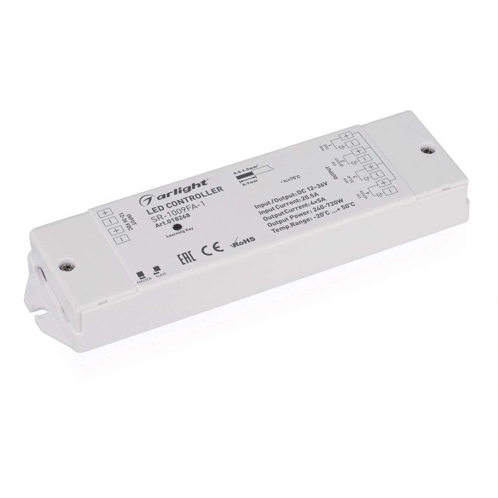 Характеристики - Контроллер SR-1009FA-1 (12-36V, 240-720W) (Arlight, IP20 Пластик, 3 года)