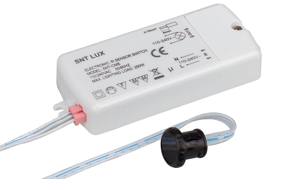 Бесконтактный ИК выключатель ламп и освещения 220В. Срабатывание от руки, чередование ВКЛ/ВЫКЛ, расстояние до 5 см. Макс.коммутируемая мощность 500W при 220VAC, AC 100-240V. Размеры: блок 110x45x15мм, датчик D13xH12мм, кабель 2м. Заменяется на 020222.