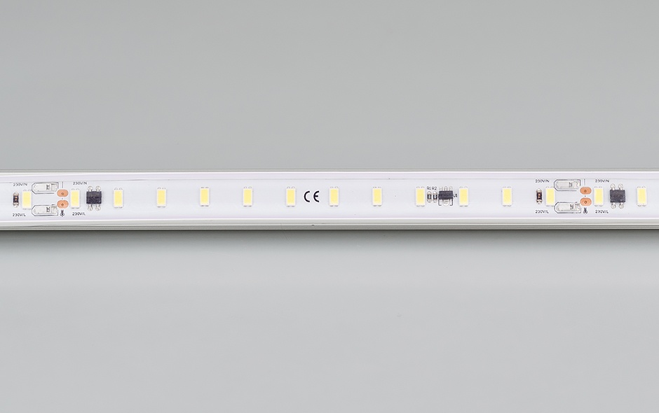 Стабилизированная лента шириной 15.5 мм в прозрачной ПВХ-оболочке с высокой степенью пылевлагозащиты (IP65). Светодиоды SMD 5630 (72 шт/м) белого цвета свечения (6000–6500 К) с индексом цветопередачи CRI>80. Напряжение питания 230 В, мощность 14 Вт/м. Прозрачные коннекторы для создания непрерывных световых линий. Лента изгибается вертикально от плоскости. Полное отсутствие пульсаций (мерцания) благодаря наличию интегрированного драйвера. Подключение напрямую к сети 230 В. Контурная подсветка, оформление наружной рекламы. Крепление на скобы, которые поставляются в комплекте. Минимальный отрезок 500 мм (36 светодиодов).