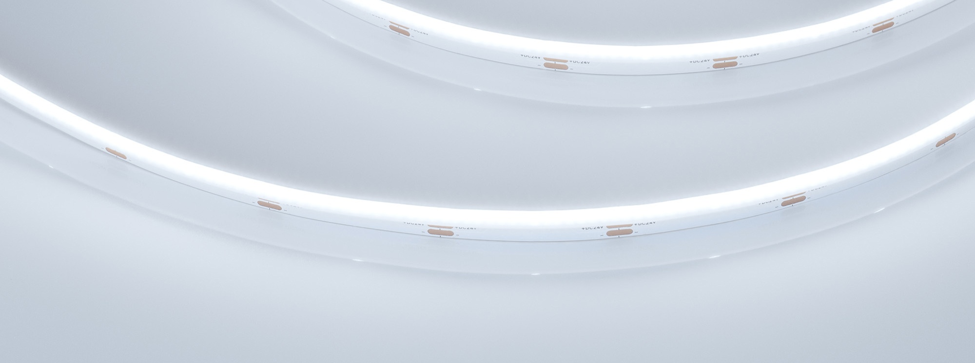 Светодиодная лента сплошного бокового свечения COB-S серии X480, мощностью 6 Вт/м. Светодиоды CSP, 480 шт/м, белого (6000K) цвета свечения. S - SideView, боковое свечение. Высокий индекс цветопередачи CRI>90 обеспечивает точное восприятие цветов. Напряжение питания 24 В, светодиоды светят в плоскости ленты. Подходит для установки в тонкие (от 4 мм) ниши для подсветки стеклянных полок, мебели, ступеней. Создает контурное свечение при установке на стенки рекламных знаков, букв. Эффект сплошной идеальной линии света без применения рассеивающих экранов.