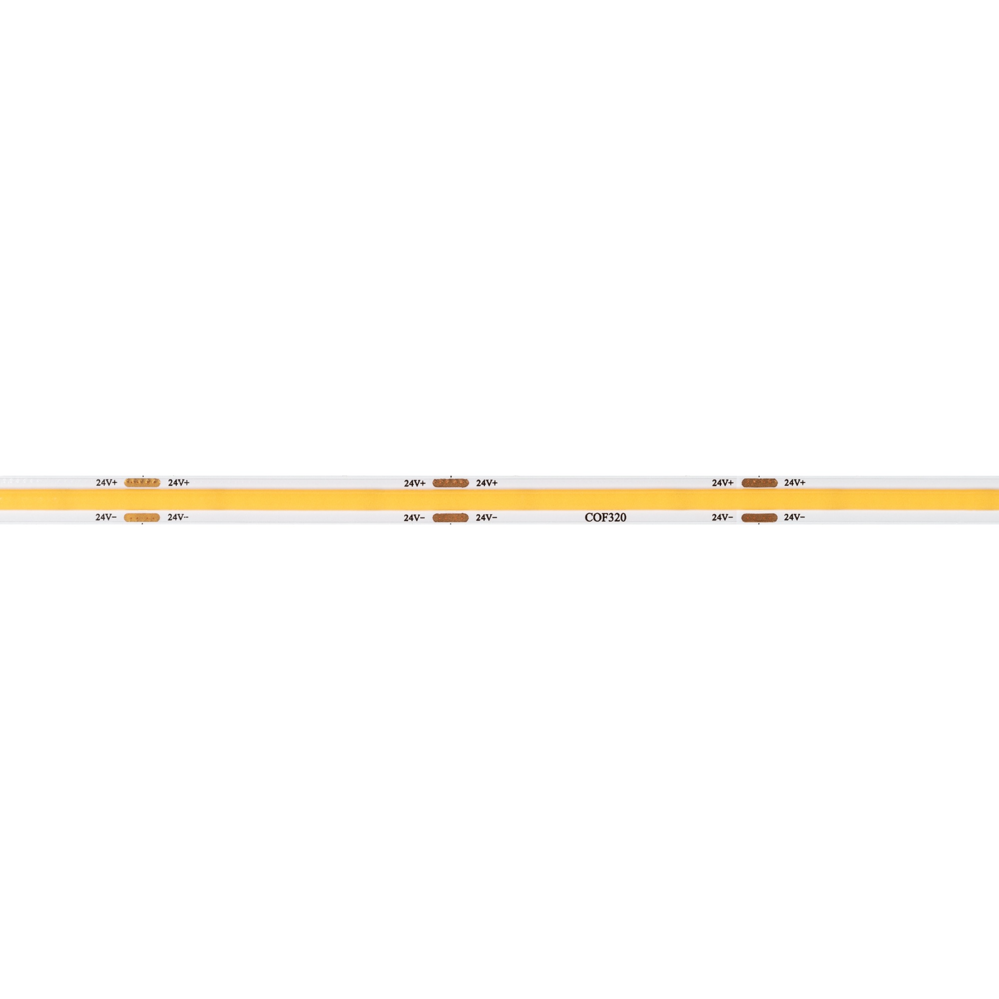 Светодиодная лента сплошного свечения COB серии X320 шириной 8 мм, мощностью 8 Вт/м. Напряжение питания 24 В. Светодиоды CSP, 320 шт/м, теплого цвета свечения (3000K). Высокий индекс цветопередачи CRI>90 обеспечивает точное восприятие цветовых оттенков при освещении любых жилых, офисных или производственных помещений. Минимальный отрезок 50 мм. В ленте используется технология ReelToReel, данная технология обеспечивает производство ленты без пайки и повышает ее механическую прочность. Эффект сплошной линии света создается без применения рассеивающих экранов. Используется для декоративной подсветки рекламных конструкций и витрин.