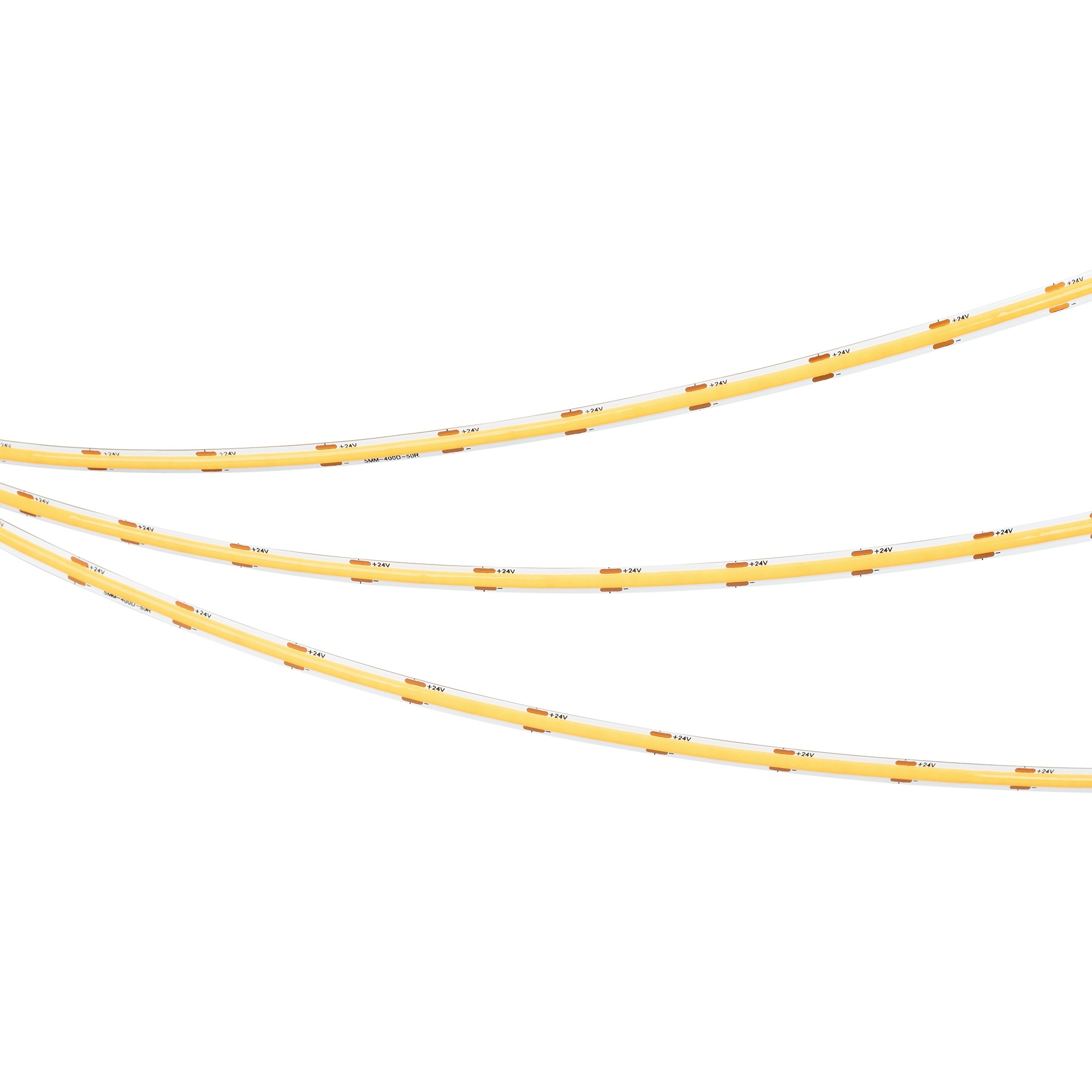 Узкая светодиодная лента сплошного свечения COB серии X400 шириной 5 мм, мощностью 7.2 Вт/м. Цвет свечения теплый (3000K). Напряжение питания 24 В. Светодиоды CSP, 400 шт/м. Высокий индекс цветопередачи CRI>90 обеспечивает точное восприятие цветовых оттенков при освещении любых жилых, офисных или производственных помещений. Эффект сплошной линии света создается без применения рассеивающих экранов. Узкая плата позволяет установить ленту в тонкий паз, применяется для подсветки витрин, рекламных конструкций, мебели, полок. Обязательна установка на профиль.