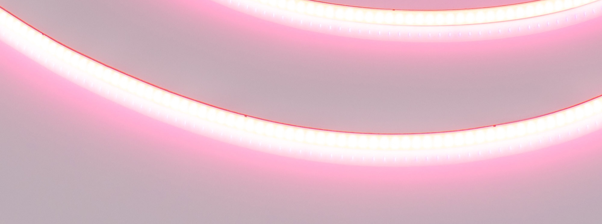 Узкая светодиодная лента сплошного свечения COB серии X480 шириной 4 мм, мощностью 4 Вт/м. Напряжение питания 24 В. Светодиоды CSP, 480 шт/м, розового цвета свечения. Минимальный отрезок 50 мм. Эффект сплошной линии света создается без применения рассеивающих экранов. Узкая плата позволяет установить ленту в тонкий паз, применяется для подсветки витрин, рекламных конструкций, мебели, полок. Рекомендуется установка на профиль.