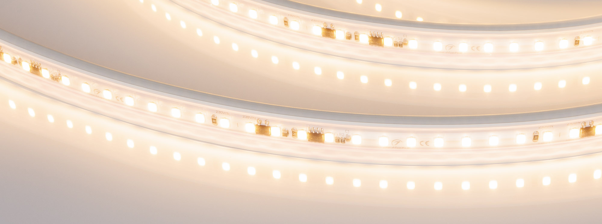 Светодиодная герметичная лента ARL серии A120 со степенью защиты IP65, защитная оболочка из ПВХ устойчива к УФ излучению, что позволяет использовать ее на улице. Высокий индекс цветопередачи CRI>85 обеспечивает точное восприятие цветовых оттенков. Лента подключается непосредственно к сети переменного тока 230 В и не требует использования источников питания. Наличие интегральных стабилизаторов тока позволяет подключать ленту длиной до 10 м, обеспечивая при этом равномерную яркость свечения по всей длине ленты. При подключении нескольких лент необходимо подавать питание на каждые 10 м отдельным кабелем, последовательное подключение лент более 10 м запрещается. Лента применяется для подсветки потолочных ниш, декоративной подсветки, создания контуров рекламных объектов, может использоваться в помещениях и на улице. На лентах установлены микросхемы с функцией снижения тока для защиты ленты от перегрева, обеспечивающие надежную работу в различных условиях. Диммирование в диапазоне 30%-90% осуществляется TRIAC диммерами с установкой минимального уровня яркости. Крепление с помощью скоб, аксессуары для монтажа и подключения поставляются отдельно. Поставка под заказ от 100 м.