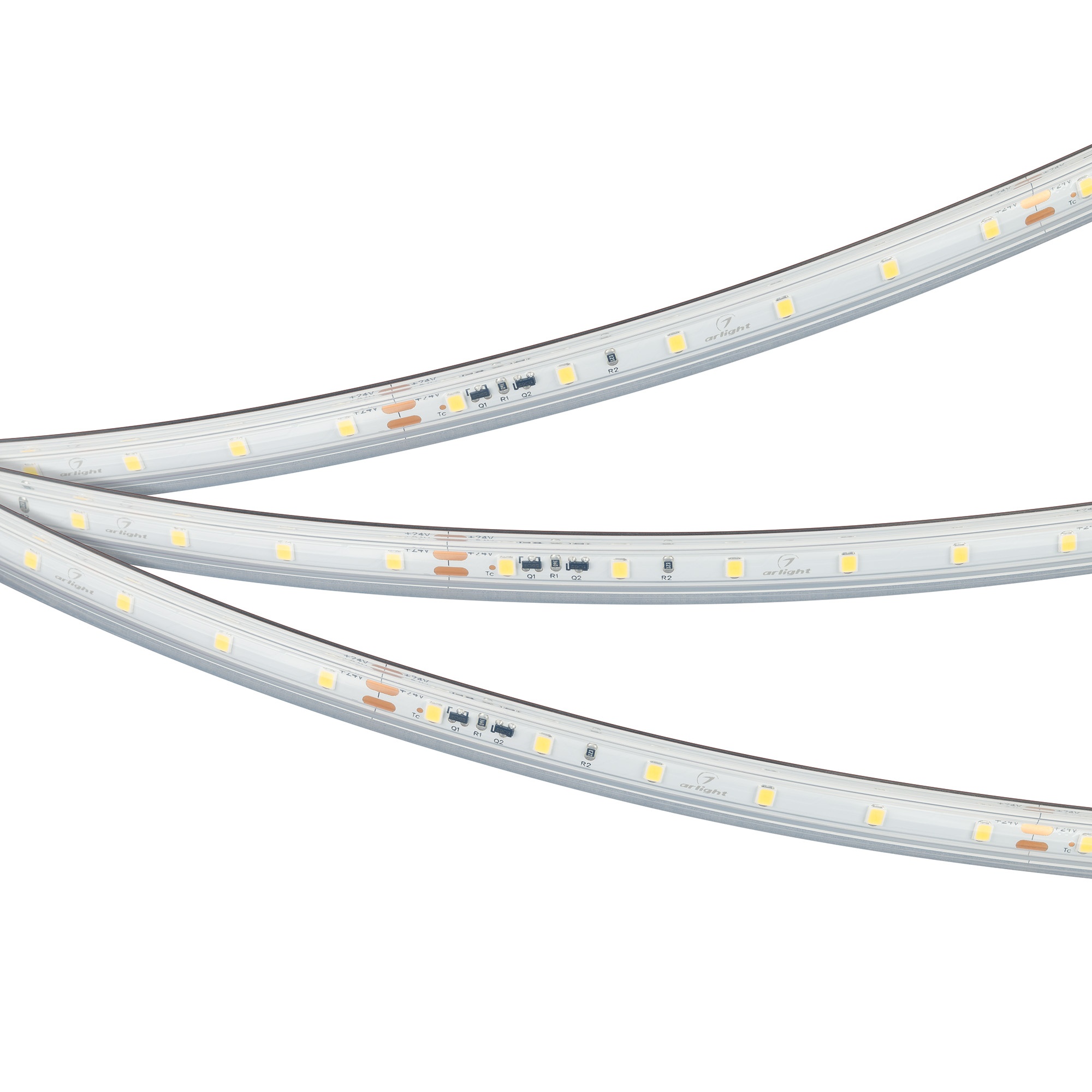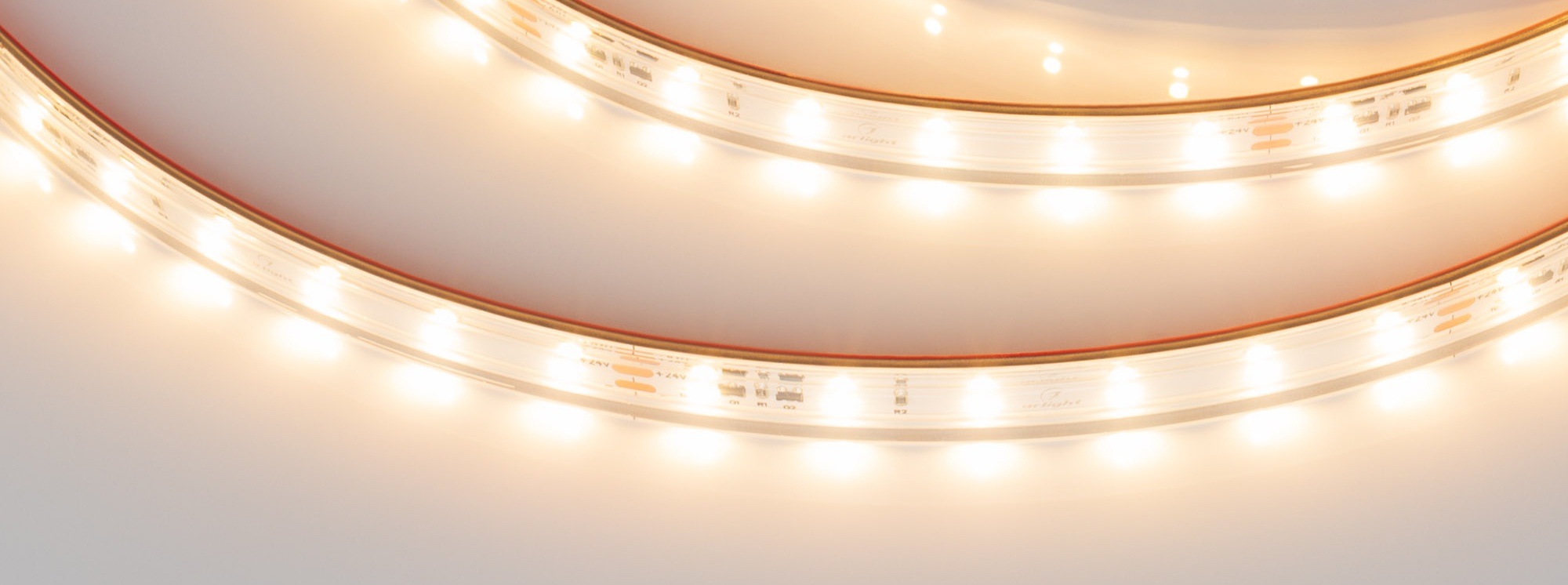 Стабилизированная герметичная лента IC серии A60 шириной 10 мм, мощностью 4.8 Вт/м, с подключением до 10 м. Стабилизаторы тока обеспечивают равномерное свечение теплого цвета (2700K) по всей длине при подключении с одной стороны. Напряжение питания 24 В. Светодиоды SMD 2835, 60 шт/м. Индекс цветопередачи CRI>80. Минимальный отрезок 100 мм (6 светодиодов). Лента совместима с любыми диммерами ШИМ. Применяется для декоративной подсветки потолочных ниш, создания длинных непрерывных световых линий, контуров рекламных объектов.