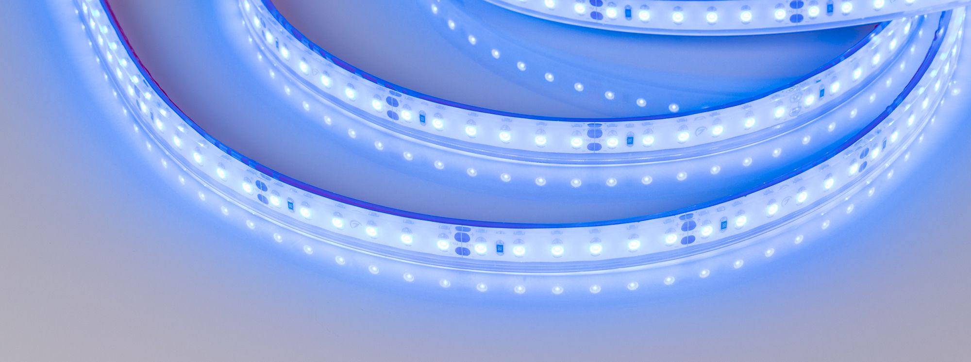 Светодиодная герметичная лента RTW серии A120 шириной 11 мм, мощностью 9.6 Вт/м, степень защиты IP68, полная силиконовая экструзия. Напряжение питания 24 В. Светодиоды SMD 2835, 120 шт/м, синего цвета свечения. Минимальный отрезок 50 мм (6 светодиодов). Лента для использования в помещениях и на улице. Применяется для декоративной подсветки интерьеров, потолочных ниш, рабочих зон кухни, влажных зон, наружной рекламы и витрин. В комплекте силиконовые клипсы для установки.