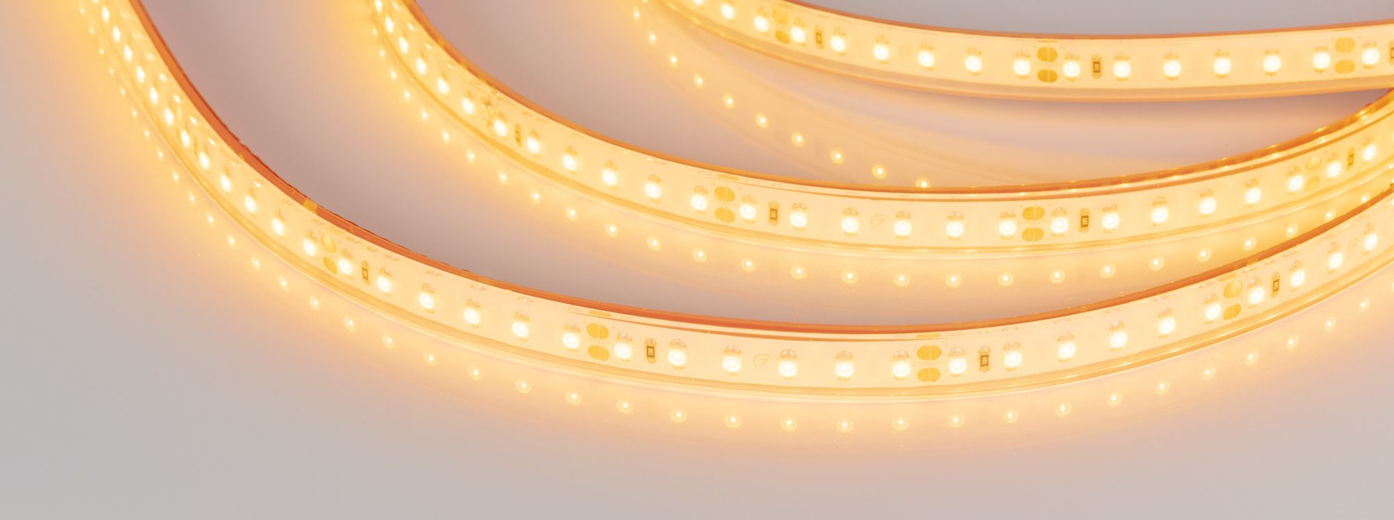 Светодиодная герметичная лента RTW серии A120 шириной 11 мм, мощностью 9.6 Вт/м, степень защиты IP68, полная силиконовая экструзия. Напряжение питания 24 В. Светодиоды SMD 2835, 120 шт/м, желтого цвета свечения. Минимальный отрезок 50 мм (6 светодиодов). Лента для использования в помещениях и на улице. Применяется для декоративной подсветки интерьеров, потолочных ниш, рабочих зон кухни, влажных зон, наружной рекламы и витрин. В комплекте силиконовые клипсы для установки.