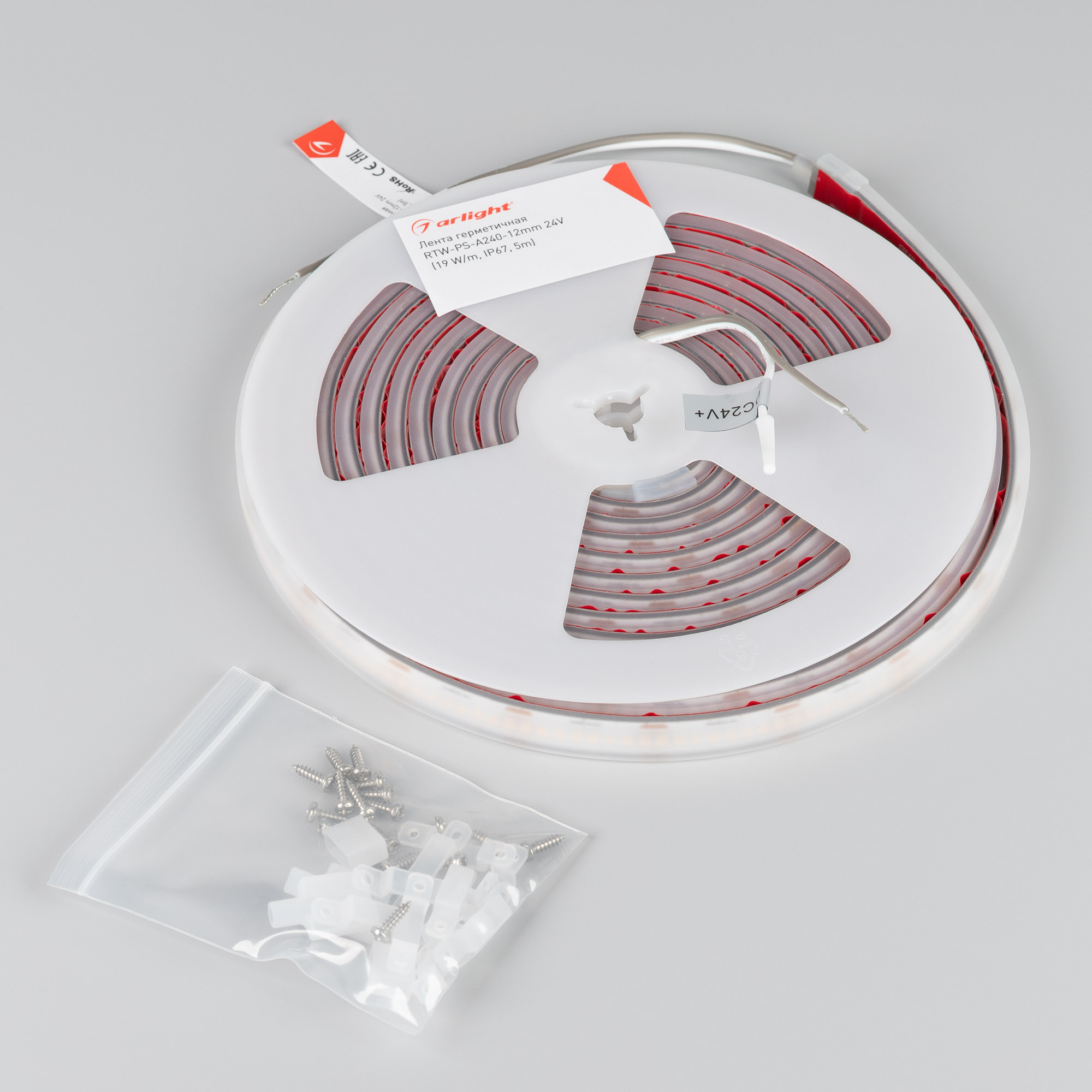 Светодиодная герметичная лента RTW серии A240 со степенью защиты IP67, силиконовая экструзия. Напряжение питания 24 В, мощность 19 Вт/м, ширина 12 мм. Светодиоды SMD 2835, 240 шт/м, теплого цвета свечения (2400K). Высокий индекс цветопередачи CRI>90 обеспечивает точное восприятие цветов и оттенков при освещении любых жилых и коммерческих помещений. Лента применяется для создания основного освещения и декоративной подсветки в интерьере и экстерьере, подсветки рекламных конструкций и витрин, наружной подсветки зданий. Идеальна для создания световых линий с равномерной засветкой и светильников на базе алюминиевого профиля. В ленте используется технология ReelToReel, обеспечивающая производство ленты без пайки и повышающая ее механическую прочность. В комплекте силиконовые клипсы 10 шт, силиконовые заглушки глухие 2 шт, силиконовые заглушки под провод 2 шт. Обязательна установка на профиль.