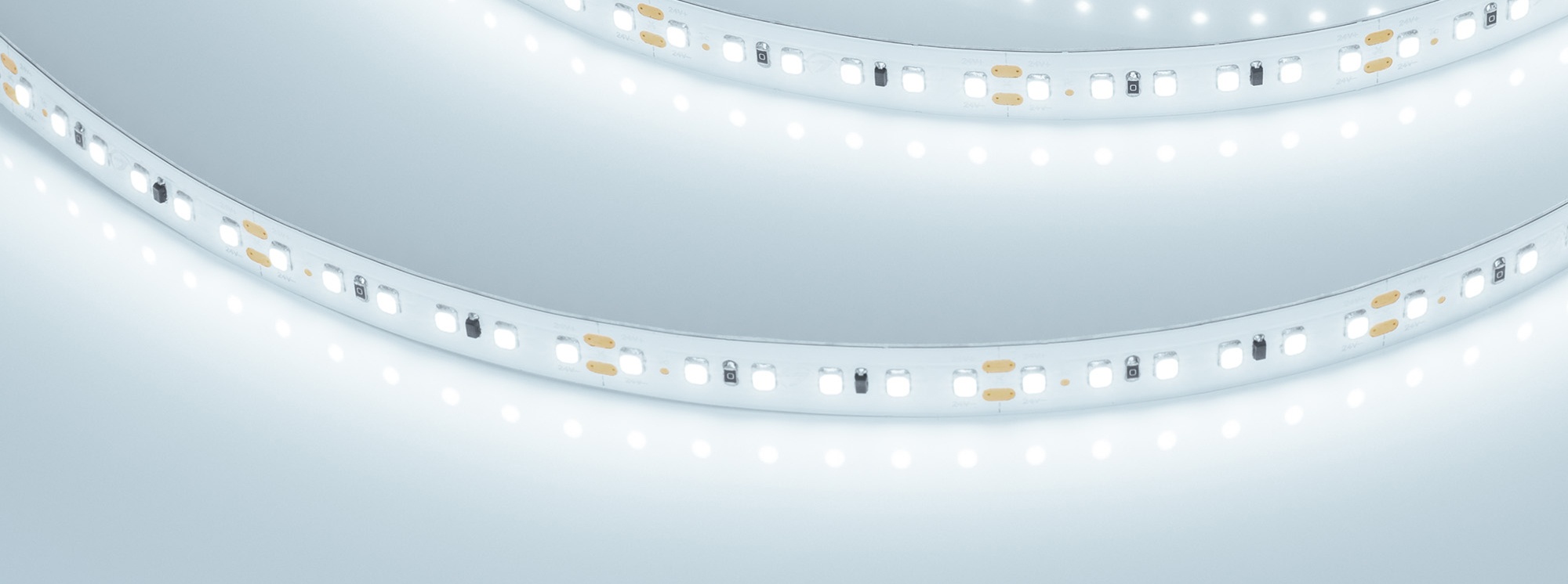 Стабилизированная светодиодная лента IC серии A120 шириной 12 мм, мощностью 9.6 Вт/м, с подключением до 20 м. Стабилизаторы тока обеспечивают равномерное свечение холодного цвета (8000K) по всей длине при подключении с одной стороны. Напряжение питания 24 В. Светодиоды SMD 2835, 120 шт/м. Индекс цветопередачи CRI>85. Минимальный отрезок 50 мм (6 светодиодов). Лента совместима с любыми диммерами ШИМ. Применяется для декоративной подсветки потолочных ниш, создания длинных непрерывных световых линий, контуров рекламных объектов.