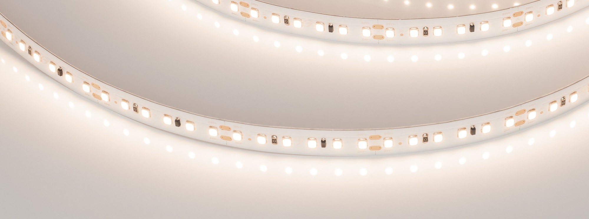 Стабилизированная светодиодная лента IC серии A120 шириной 12 мм, мощностью 9.6 Вт/м, с подключением до 20 м. Стабилизаторы тока обеспечивают равномерное свечение теплого цвета (3500K) по всей длине при подключении с одной стороны. Напряжение питания 24 В. Светодиоды SMD 2835, 120 шт/м. Индекс цветопередачи CRI>85. Минимальный отрезок 50 мм (6 светодиодов). Лента совместима с любыми диммерами ШИМ. Применяется для декоративной подсветки потолочных ниш, создания длинных непрерывных световых линий, контуров рекламных объектов.