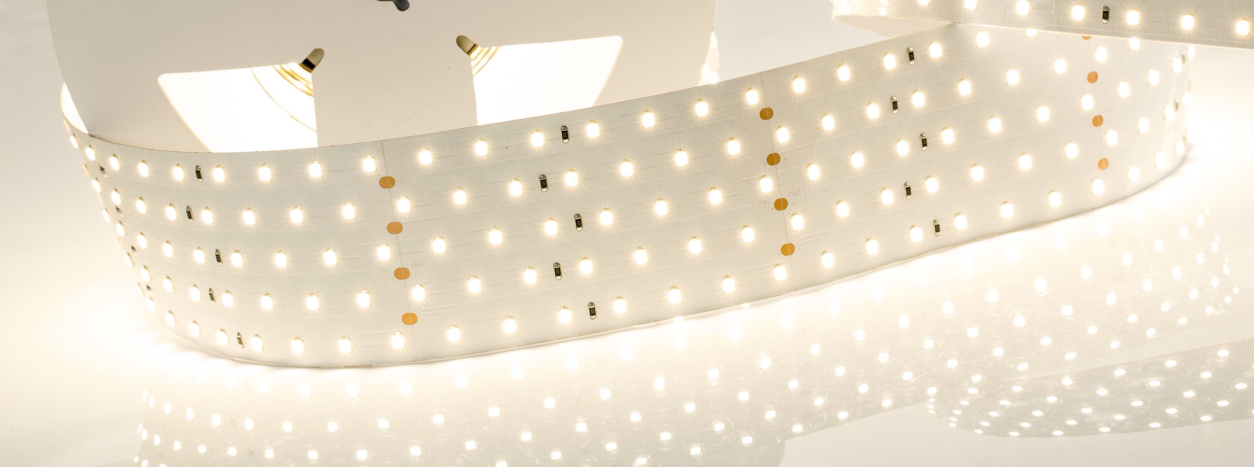 Широкая лента LUX шириной 58 мм с индексом цветопередачи CRI>85. Светодиоды SMD 2835 (350 шт/м) с цветовой температурой 2600–2800 К. Мощность 36 Вт/м, напряжение питания 24 В. Минимальный отрезок 100 мм (35 светодиодов). Может использоваться с любыми профилями. Равномерное свечение по всей ширине профиля. Встроенные широкие линии света для основного освещения. Создание накладных и подвесных светильников из алюминиевого профиля.