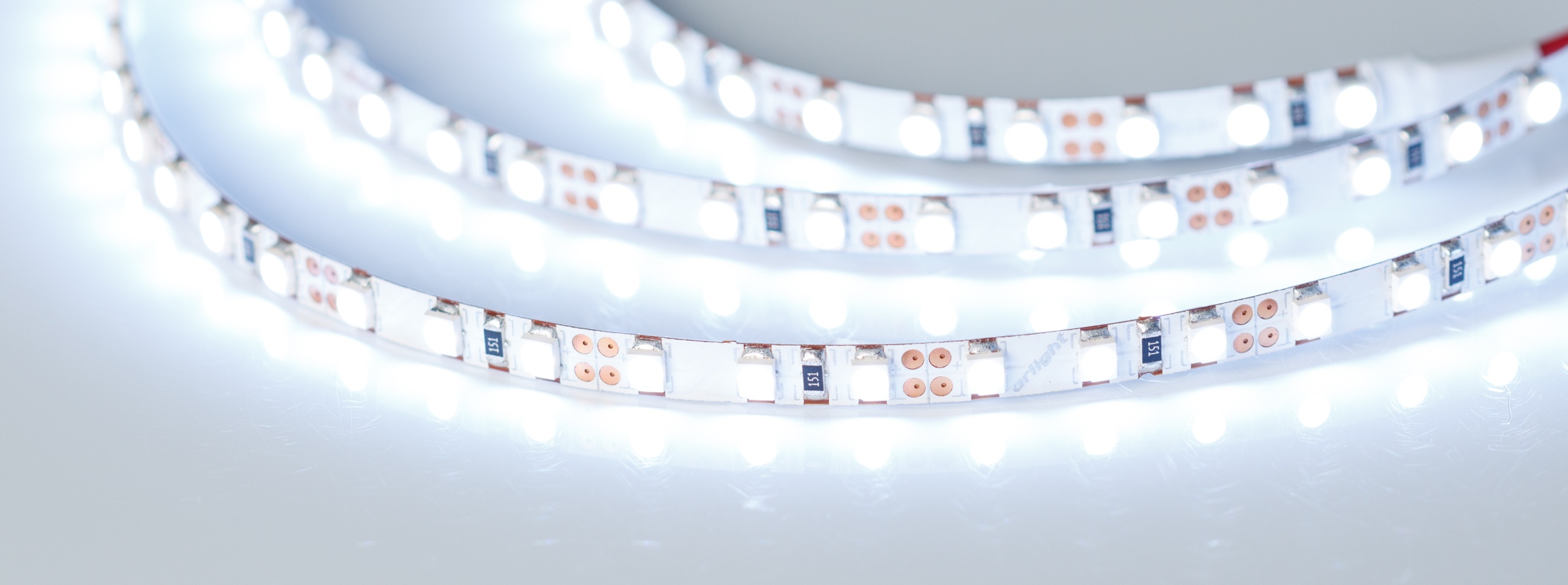 Узкая светодиодная лента 5 мм серии LUX с питанием 12 В и мощностью 9.6 Вт/м. Светодиоды 2x SMD 3528 холодного белого цвета свечения (15 000 - 20 000 К) с плотностью расстановки 120 шт/м. Индекс цветопередачи CRI>85 и степень пылевлагозащиты IP20. Для создания качественной декоративной подсветки в помещениях: подсветка лестниц, ступеней, плинтусов, ниш, мебельных полок, натяжных потолков, витражей, стекол. Может использоваться для создания световой рекламы: подсветка лайтбоксов, вывесок, букв, витрин. Обязательна установка на профиль. Идеально подходит для установки в узкий паз.