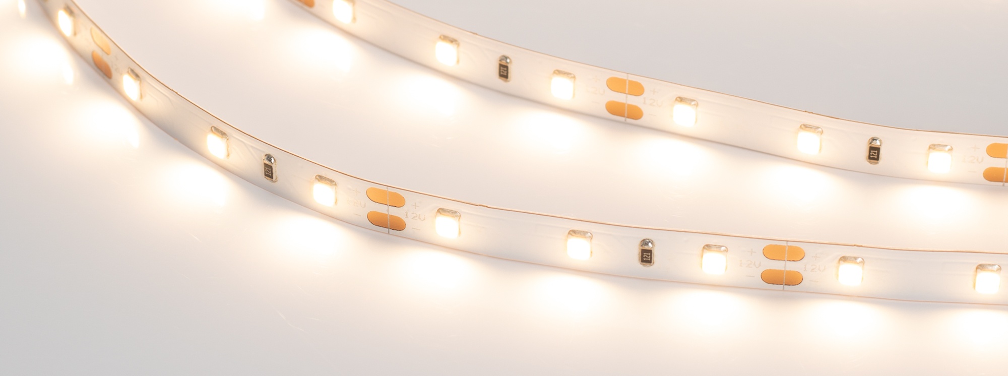 Открытая светодиодная лента шириной 8 мм и мощностью 7.2 Вт/м с индексом цветопередачи CRI>85. Напряжение питания 12 В. Светодиоды SMD 2835 (60 шт/м) теплого белого цвета свечения (2900–3100 К). Минимальный отрезок 50 мм (3 светодиода). Для создания качественного основного освещения и декоративной подсветки интерьеров, рекламных конструкций и витрин.