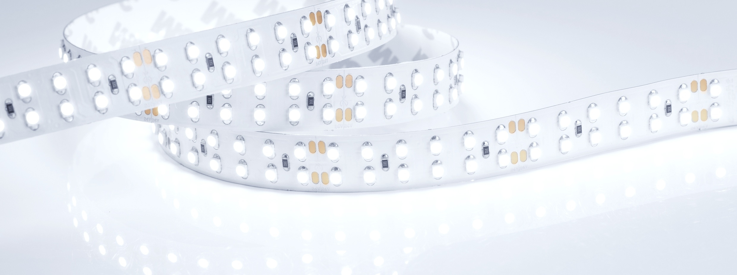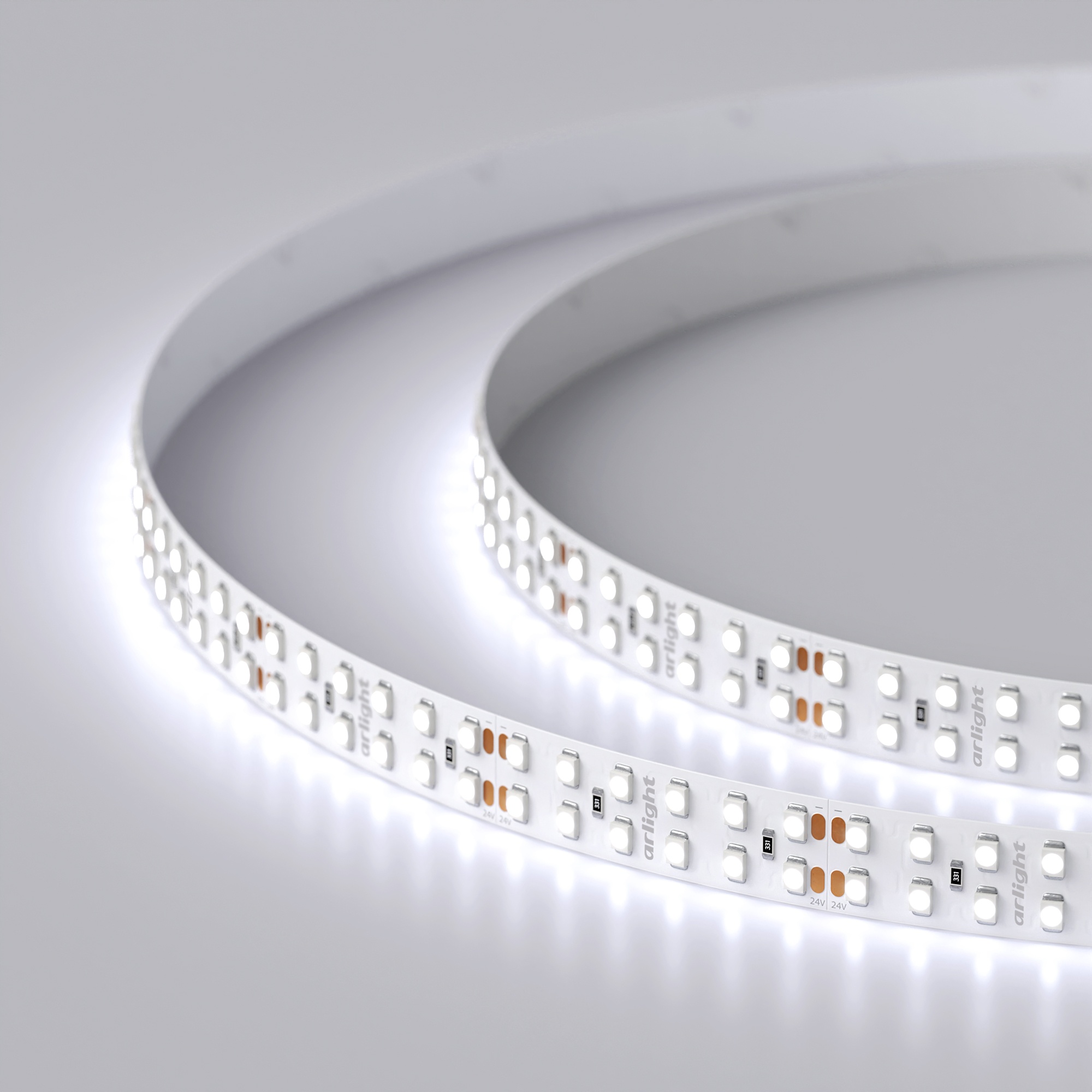 Широкая двухрядная светодиодная лента LUX шириной 15 мм. Светодиоды SMD 3528 (240 шт/м) с холодным белым цветом свечения (7700–9600 К), индекс цветопередачи CRI>85. Мощность 19.2 Вт/м, напряжение питания 24 В. Минимальный отрезок 50 мм (12 светодиодов). Встроенные линии света для основного освещения. Создание накладных и подвесных светильников из алюминиевого профиля.