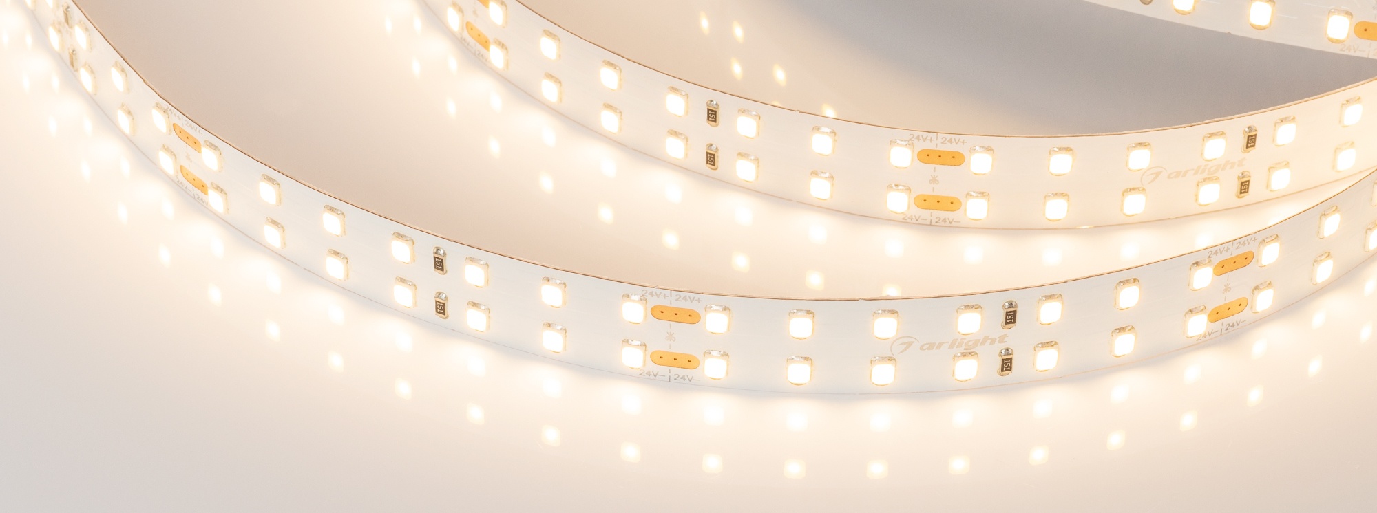 Широкая двухрядная лента LUX шириной 15 мм с индексом цветопередачи CRI>85 и высокой световой эффективностью >125 лм/Вт. Светодиоды SMD 2835 (196 шт/м) с теплым белым цветом свечения (2600–2800 К). Мощность 20 Вт/м, напряжение питания 24 В. Минимальный отрезок 71.43 мм (14 светодиодов). Встроенные линии света для основного освещения. Создание накладных и подвесных светильников из алюминиевого профиля.
