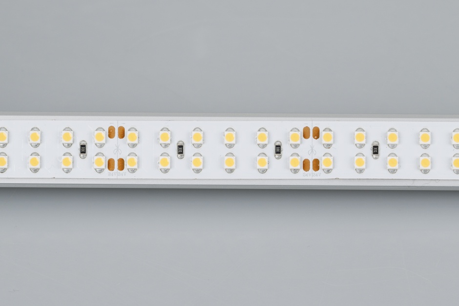 Широкая двухрядная светодиодная лента LUX шириной 15 мм с очень высоким индексом цветопередачи CRI>98. Светодиоды SMD 3528 (240 шт/м) с теплым белым цветом свечения (2600–2800 К). Мощность 19.2 Вт/м, напряжение питания 24 В. Минимальный отрезок 50 мм (12 светодиодов). Декоративная подсветка интерьера, потолочных ниш, рабочих зон кухни, мебели. Подсветка рекламных конструкций и витрин.