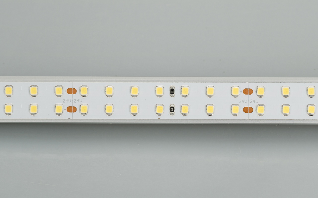 Широкая двухрядная лента LUX шириной 15 мм с очень высоким индексом цветопередачи CRI>98 и высокой световой эффективностью. Светодиоды SMD 2835 (196 шт/м) с теплым белым цветом свечения (2900–3100 К). Мощность 16.6 Вт/м, напряжение питания 24 В. Минимальный отрезок 71.43 мм (14 светодиодов). Может использоваться с любыми профилями. Встроенные линии света для основного освещения. Создание накладных и подвесных светильников из алюминиевого профиля.