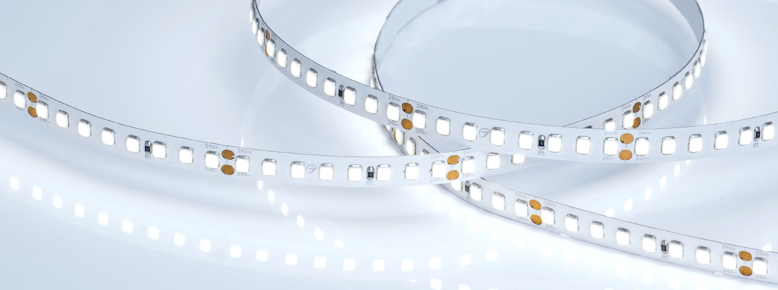 Светодиодная лента шириной 8 мм и мощностью 12 Вт/м. Светодиоды SMD 2835 (120 шт/м) белого холодного цвета свечения (7700–9600 К). Высокая световая эффективность 150 лм/Вт. Напряжение питания 24 В. Минимальный отрезок 50 мм (8 светодиодов). Для основного и декоративного освещения, подсветки рекламных конструкций и витрин.