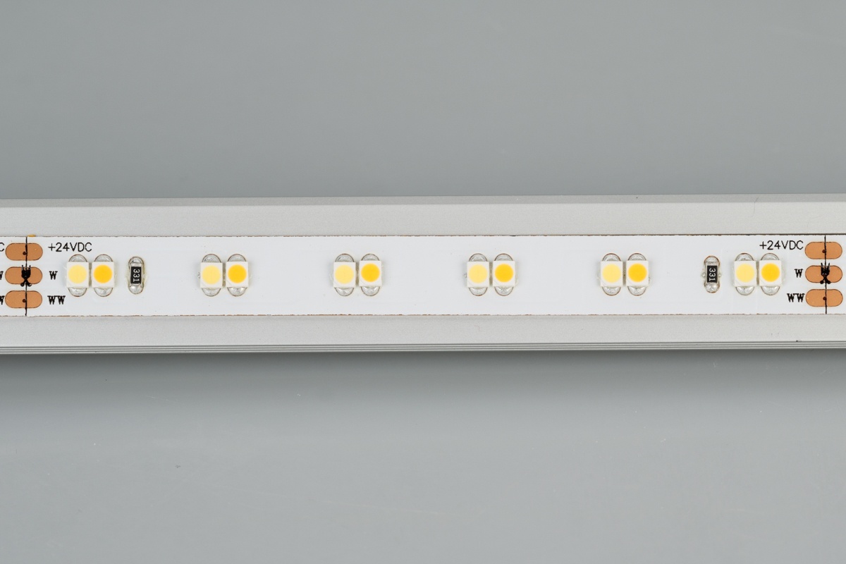 2-канальная лента MIX лента шириной 10 мм с изменяемым цветом свечения: белым (6500 K) и теплым белым (2700 K). Светодиоды SMD 3528 (120 шт/м) с высоким индексом цветопередачи (CRI>90). Мощность 9.6 Вт/м, напряжение питания 24 В. Минимальный отрезок 100 мм (12 светодиодов). Позволяет получить любой оттенок белого цвета в широком диапазоне: от теплого до холодного. Управляется любым MIX-контроллером. Декоративная подсветка ниш, элементов декора, рабочих зон кухни и мебели. Подсветка рекламных конструкций и витрин.