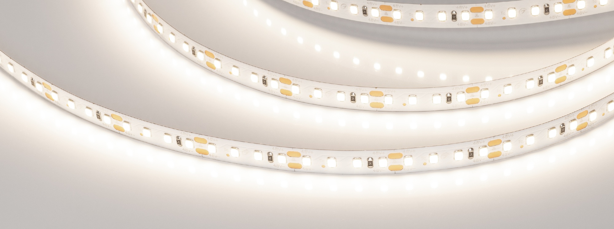 Светодиодная лента RT серии A120. Напряжение питания 48 В, мощность 9.6 Вт/м, ширина 10 мм. Длина подключения 30 м с одной стороны, лента без стабилизаторов. Светодиоды SMD 2835, 120 шт/м, дневного цвета свечения (4000K). Применяется для декоративной подсветки интерьеров, потолочных ниш, рабочих зон кухни, мебели, подсветки рекламных конструкций и витрин. Увеличенная длина подключения позволяет создавать длинные декоративные линии и организовать подсветку протяженных участков. Рекомендуется установка на профиль.