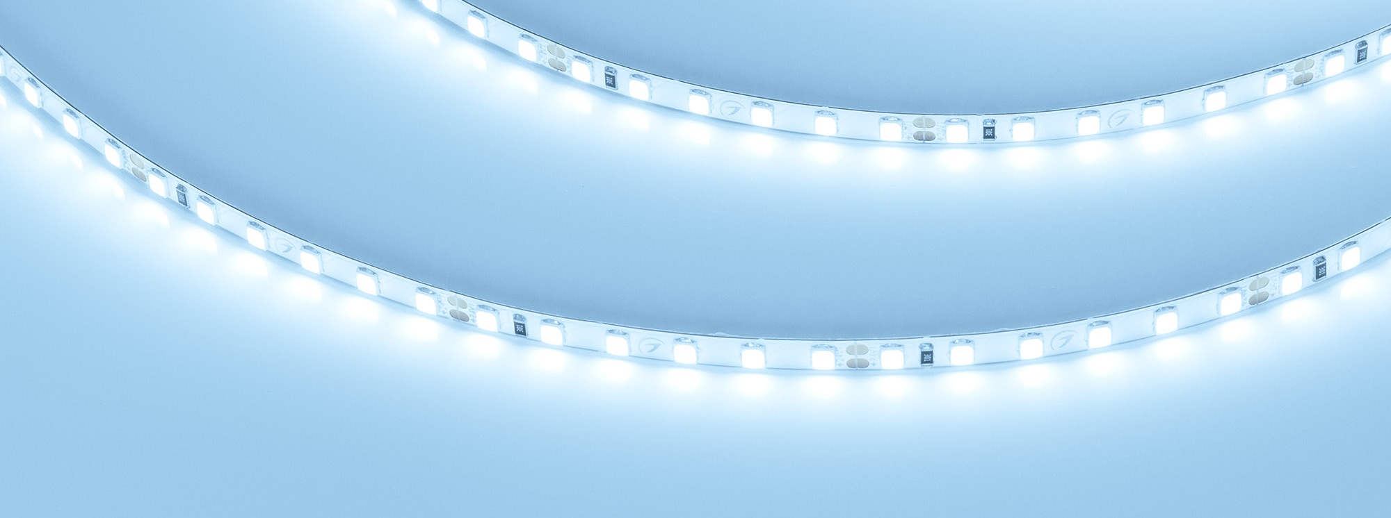 Узкая светодиодная лента RT серии A120 шириной 5 мм. Тип светодиода SMD 2835, 120 шт/м, холодного цвета свечения (15000K). Напряжение питания 24 В, мощность 9.6 Вт/м. Минимальный отрезок 50 мм (6 светодиодов). Универсальная лента для организации декоративной подсветки в помещениях, подсветка лестниц, ступеней, перил, плинтусов, ниш, мебельных полок, натяжных потолков, витражей. Узкая плата плата позволяет установить ленту в тонкий паз. Используется для рекламных конструкций и витрин.