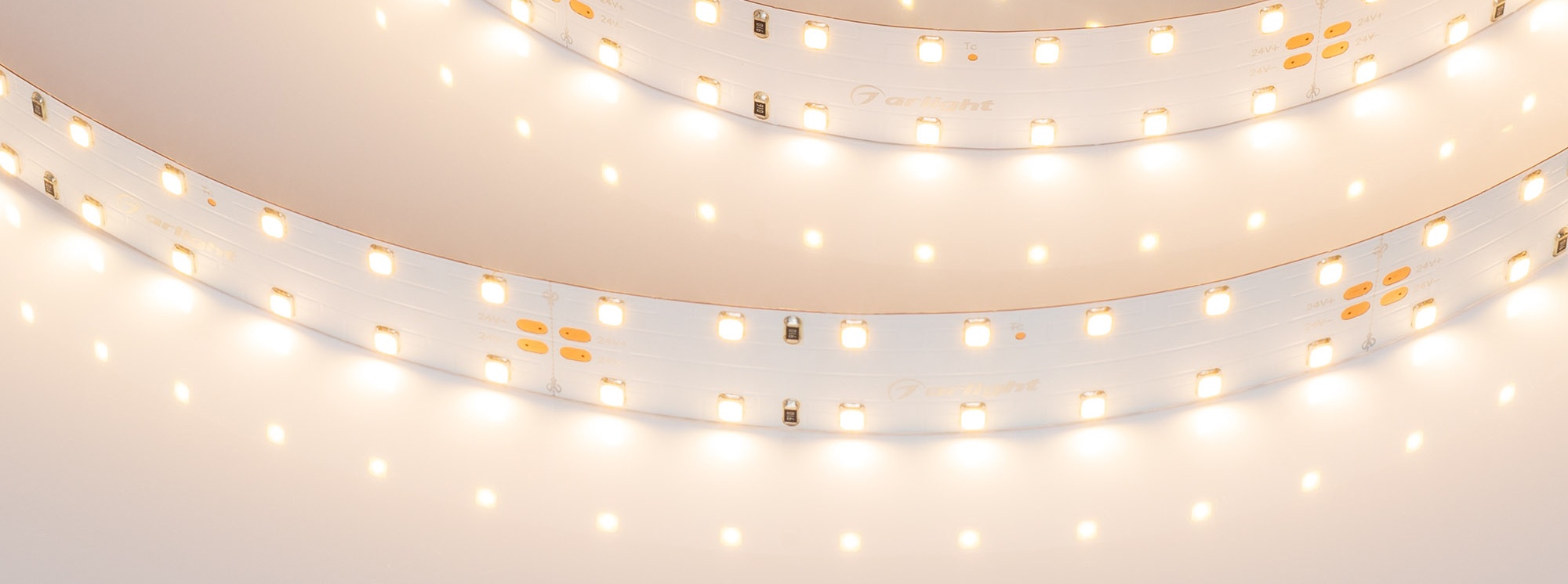 Светодиодная лента RT серии A140, светодиоды SMD 2835, 140 шт/м, теплого цвета свечения (3000K). Ширина платы 20 мм. Предназначена для использования в дуговом и линейном профиле серии SL-ARC при создании светильников со свечением, направленным внутрь или наружу от круга (линии). Минимальный отрезок 98 мм (14 светодиодов).