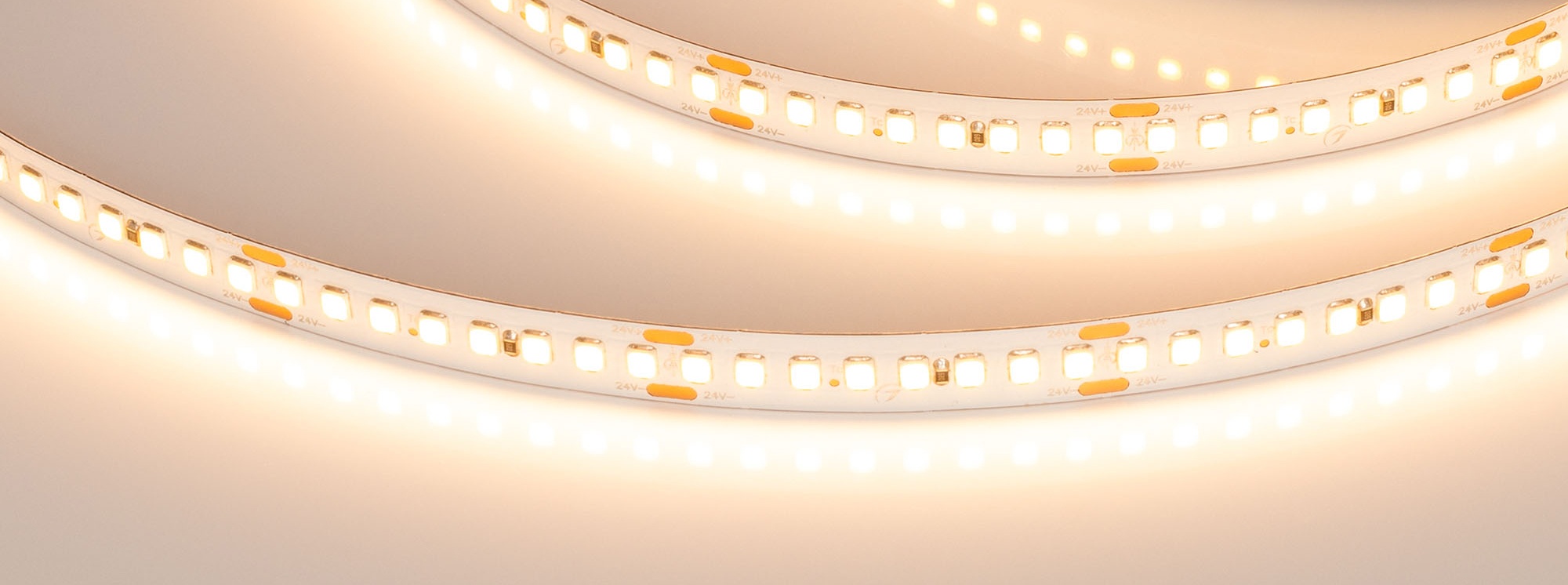 Высокоэффективная светодиодная лента RT серии A192. Напряжение питания 24 В, мощность 17.6 Вт/м, ширина 10 мм. Светодиоды SMD 2835, 192 шт/м, теплого цвета свечения (2400K). Высокая световая эффективность (150 лм/Вт) позволяет применять ленты для основного энергоэффективного освещения жилых и коммерческих помещений. Декоративной подсветки рекламных конструкций и витрин, подсветки интерьера, потолочных ниш. Обязательная установка на профиль.