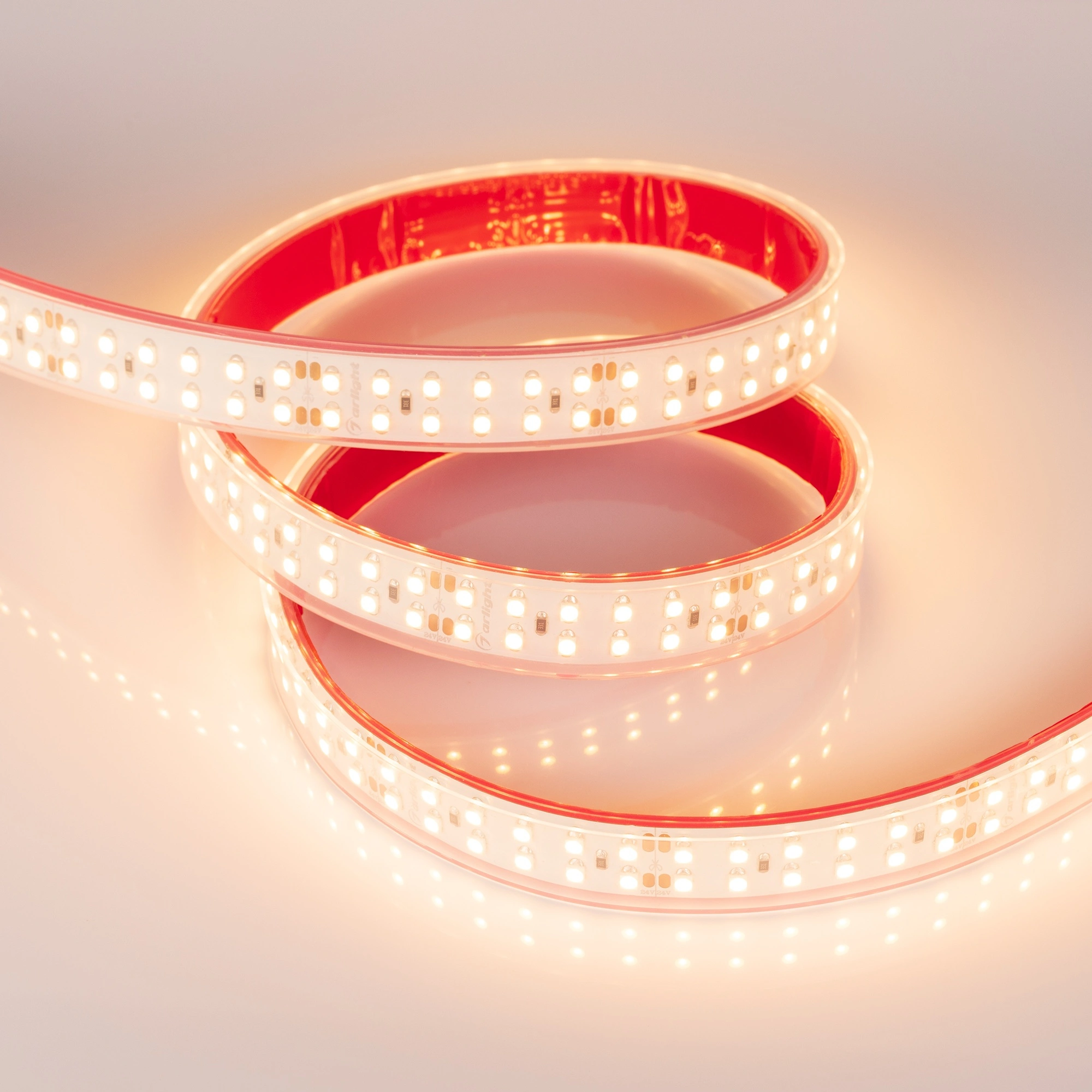 Герметичная двухрядная светодиодная лента шириной 17.5 мм в силиконовой трубке с высокой степенью пылевлагозащиты IP66. Светодиоды SMD 3528 (240 шт/м) теплого белого цвета свечения (2600–2800 К). Индекс цветопередачи CRI>85. Мощность 19.2 Вт/м, напряжение питания 24 В. Минимальный отрезок 50 мм (12 светодиодов). Может использоваться с любыми алюминиевыми профилями. Встроенные линии света для основного освещения. Создание накладных и подвесных светильников. Возможно использование во влажных помещениях и на улице.
