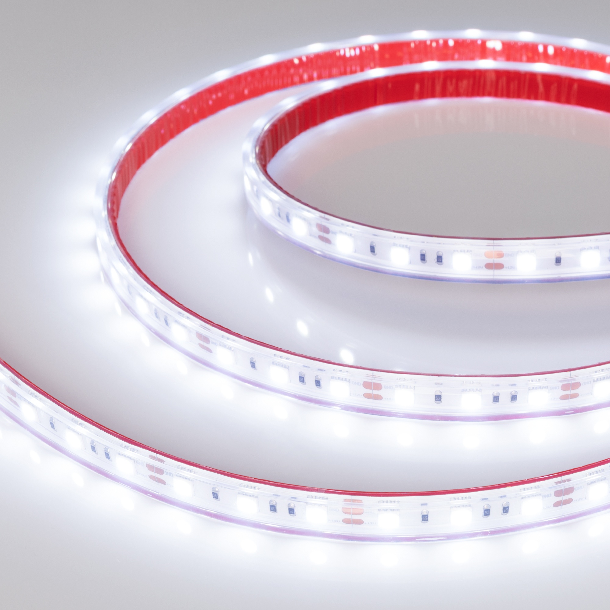 Герметичная светодиодная лента LUX шириной 12 мм в силиконовой трубке с высокой степенью пылевлагозащиты IP67. Светодиоды SMD 5060 (60 шт/м) с холодным белым цветом свечения (7700–9600 К). Мощность 14.4 Вт/м, напряжение питания 12 В. Минимальный отрезок 50 мм (3 светодиода). Освещение интерьеров и создание декоративной подсветки, оформление наружной рекламы и витрин. Возможно использование во влажных помещениях.
