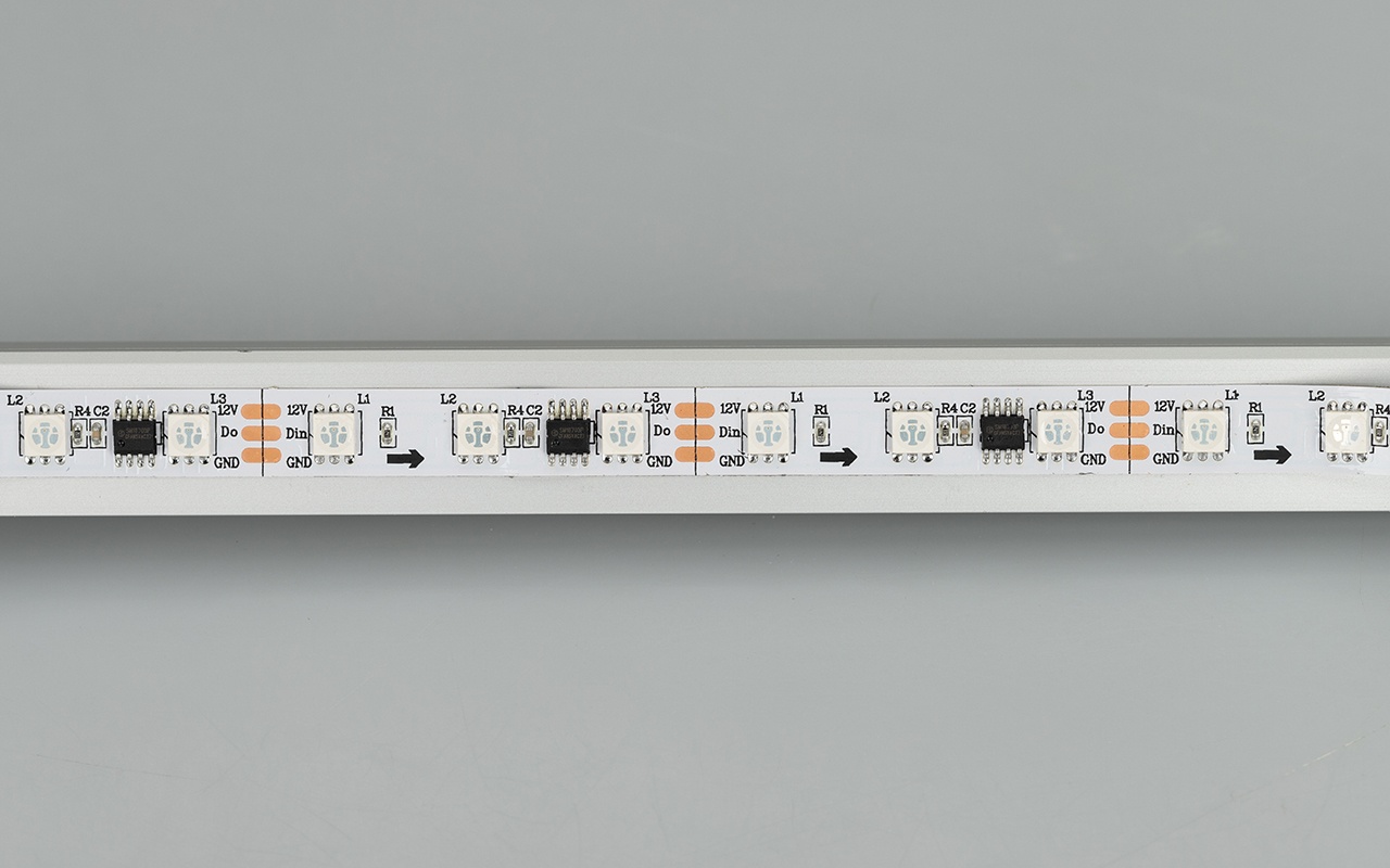 Многоцветная лента «бегущий огонь» с драйвером 16703. Рекомендуется подводка питания с двух сторон ленты. RGB-светодиоды SMD 5060 (60 шт/м). Возможно подключение внешнего контроллера. Ширина платы 10 мм, мощность 14.4 Вт/м, напряжение питания 12 В. Для создания многоцветных световых эффектов различной сложности: от простейшего эффекта «бегущий огонь» до воспроизведения динамических изображений на мультимедийных экранах. Основные области применения ленты — создание рекламных вывесок, оформление витрин, помещений для дискотек, ресторанов, театрализованных шоу, изготовление медиафасадов. Минимальный отрезок 50 мм.