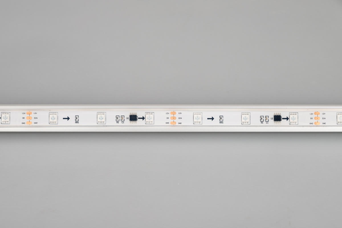 Герметичная лента «бегущий огонь» с драйвером 16703. RGB-светодиоды SMD 5060 (30 шт/м) в литой силиконовой трубке с высокой степенью пылевлагозащиты (IP67). Управление от внешнего контроллера SPI, без авторежима. Ширина платы 12 мм, мощность 7.2 Вт/м, напряжение питания 12 В. Создание рекламных вывесок, оформление витрин, помещений для дискотек, ресторанов, театрализованных шоу, изготовление медиафасадов. Минимальный отрезок 100 мм.