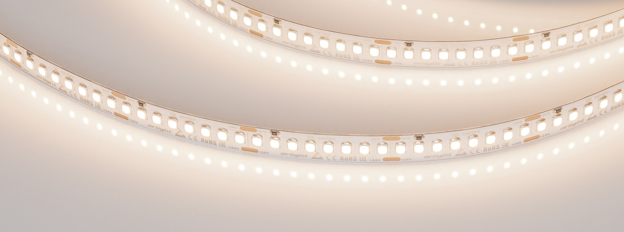 Высокоэффективная лента UL серии A200 с гарантией 7 лет. Светодиоды SMD 2835, 200 шт/м, теплого цвета свечения (3500K). Напряжение питания 24 В, мощность 20 Вт/м, ширина 10 мм. Световая эффективность свыше 150 лм/Вт и высокий индекс цветопередачи CRI>90 позволяют использовать ленту для качественного, высокоэффективного основного и декоративного освещения. Применима для создания линейных светильников на основе алюминиевого профиля. Для обеспечивания теплоотвода установка на алюминиевый профиль обязательна.