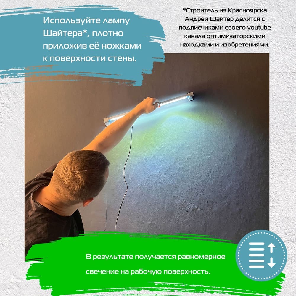 Лампа маляра со специальным углом свечения позволяет контролировать качество штукатурных и покрасочных работ. Легкий по весу светильник оснащен удобной ручкой-держателем, которая позволяет устанавливать светильник в любом положении и быстро изменять его. Ножки из ABS пластика не пачкают поверхность и не оставляют следов, а длинный 5-ти метровый кабель позволит избавиться от дополнительных удлинителей.