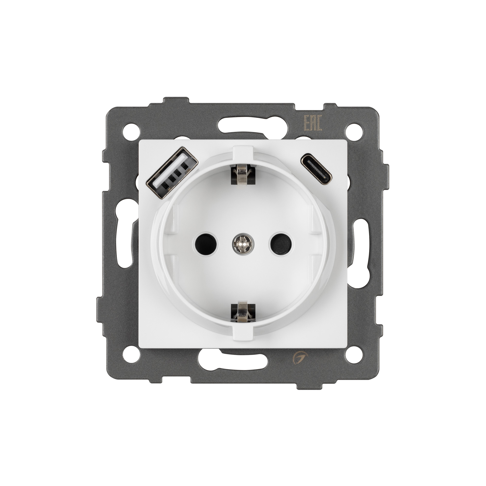 Механизм розетки с заземлением совместим с рамками серий OMALI/AKYRI/PERIO/XSILO. Скрытый тип монтажа позволяет гармонично встроить в интерьер любого современного дизайн-проекта. Видимая часть механизма выполнена из высококачественного пластика белого цвета. Контактная часть присоединяется при помощи винтовых зажимов, а усиленные распорные лапки надежно фиксируют механизм в установочном подрозетнике. Дополнительно встроены два зарядных порта USB Type A 5V/2.1A.
