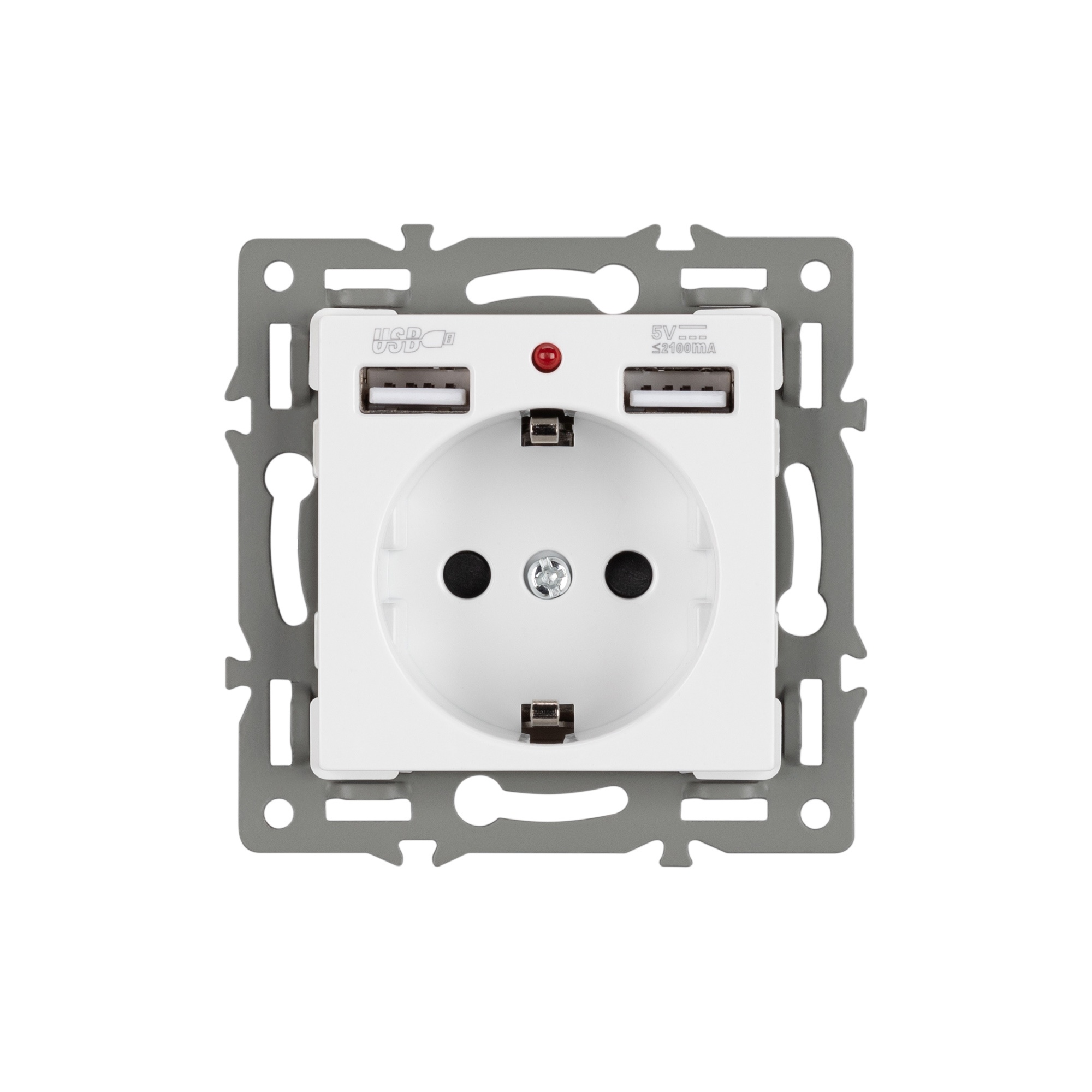 Механизм розетки с заземлением на 1 пост, совместим с рамками серий VERSA/GLARE/PRESTO. Помимо основного разъема, так же предусмотрено два выхода USB Type-A. Накладной тип монтажа позволяет с легкостью произвести монтаж/замену. Видимая часть механизма выполнена из высококачественного тугоплавкого пластика белого цвета. Контактная часть присоединяется при помощи винтовых зажимов, а усиленные монтажные лапки надежно фиксируют механизм в установочном подрозетнике. Степень защиты IP20 допускает использование устройства во влажных помещениях, с соблюдением требований эксплуатации.