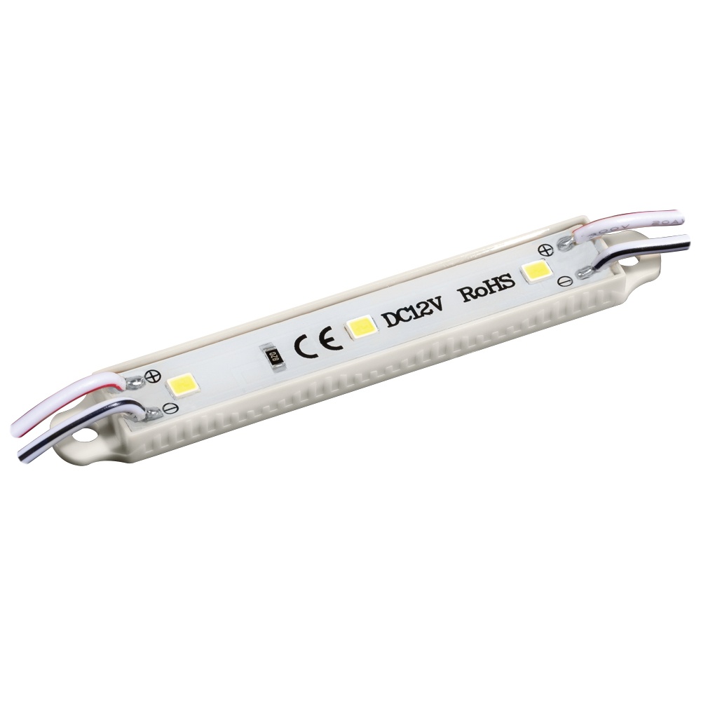 Светодиодный модуль 3шт smd 2835, цвет БЕЛЫЙ 6500-7000К, угол 120°. Световой поток 30 люмен. Питание 12В, мощность 0.33 Вт. Корпус IP65 ABS. Габариты ДхШхВ - 80x12x5 мм. На проводе 20шт. Длина провода 105мм, между центрами 170мм.