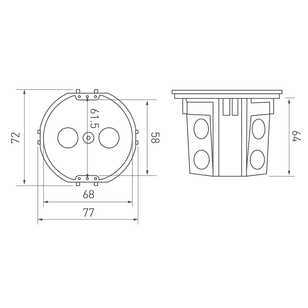 Монтажная коробка (подрозетник) для электроустановочных изделий, круглого сечения диаметром 68мм. Устанавливается в заранее подготовленное место. Подходит для бетонных или кирпичных стен. Подрозетник имеет 12 кабель выводов