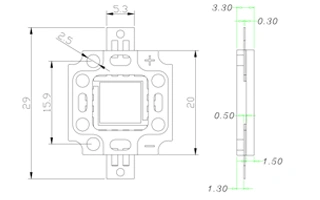 Мощный светодиод, размер 29×20×3,3 мм, светящая область 10×10 мм. Цвет свечения белый (6000-6500 К). Угол 120°. Световой поток 800 лм при If=350 мА, P=10 Вт. VF=28-33 В. CRI>70.